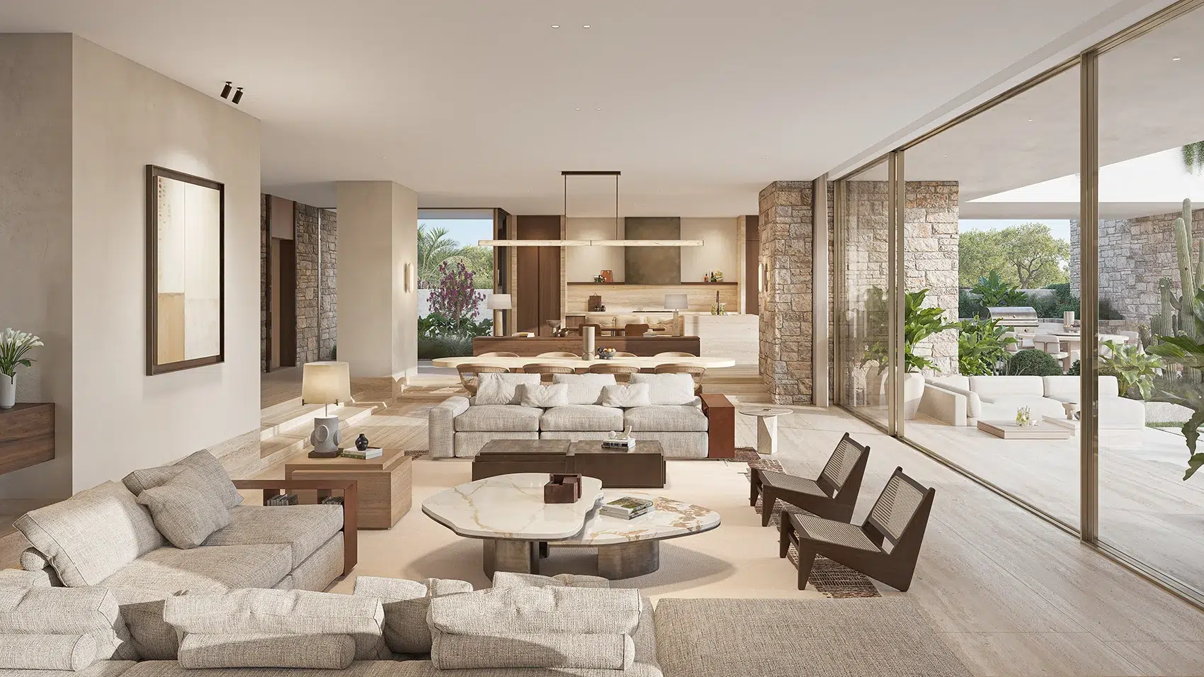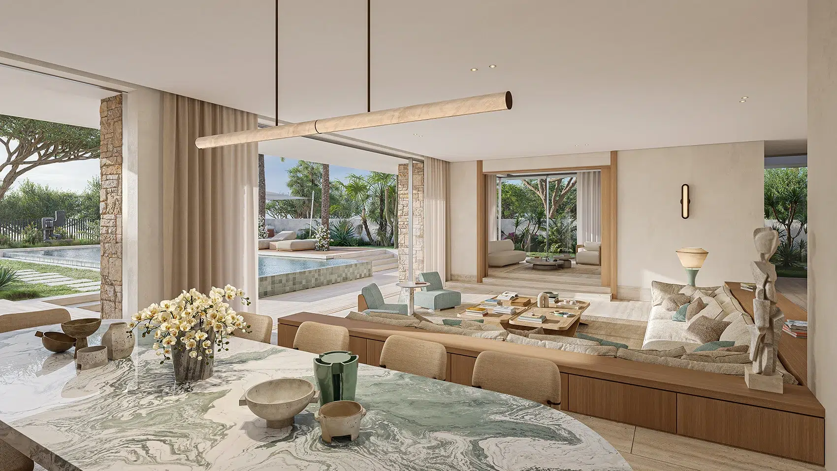 Floor-to-ceiling glass frames serene garden vistas, while shaded terraces, swimming pools, and landscaped gardens create a seamless interplay between architecture and nature — all within the safety and tranquillity of a gated community.