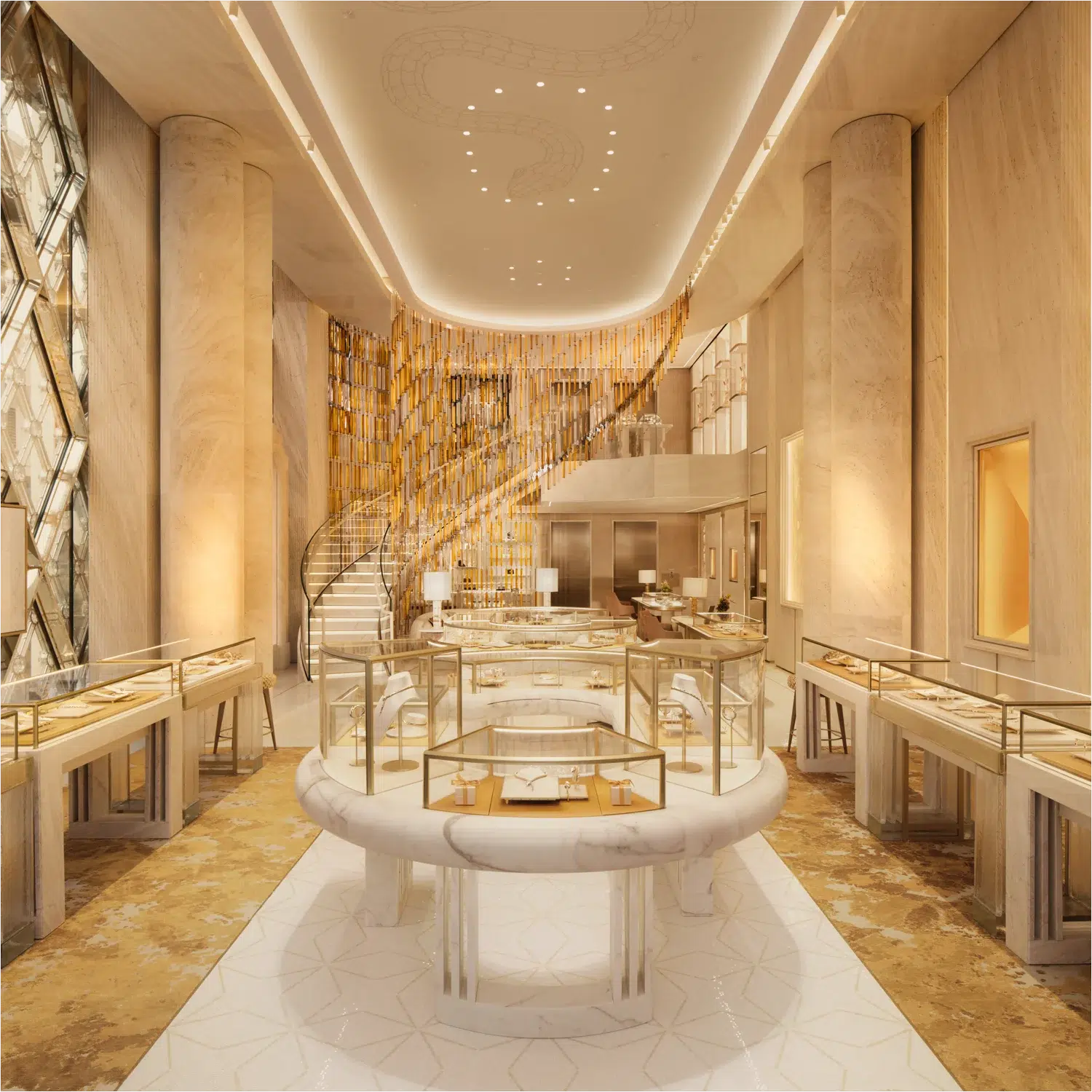 The aesthetic strikes a careful balance. Amber tones and Roman stone create warmth and depth, while meticulous craftsmanship and a clean retail layout highlight every collection—from Serpenti and Divas’ Dream to B.Zero1 and Octo—with gallery-like precision.
