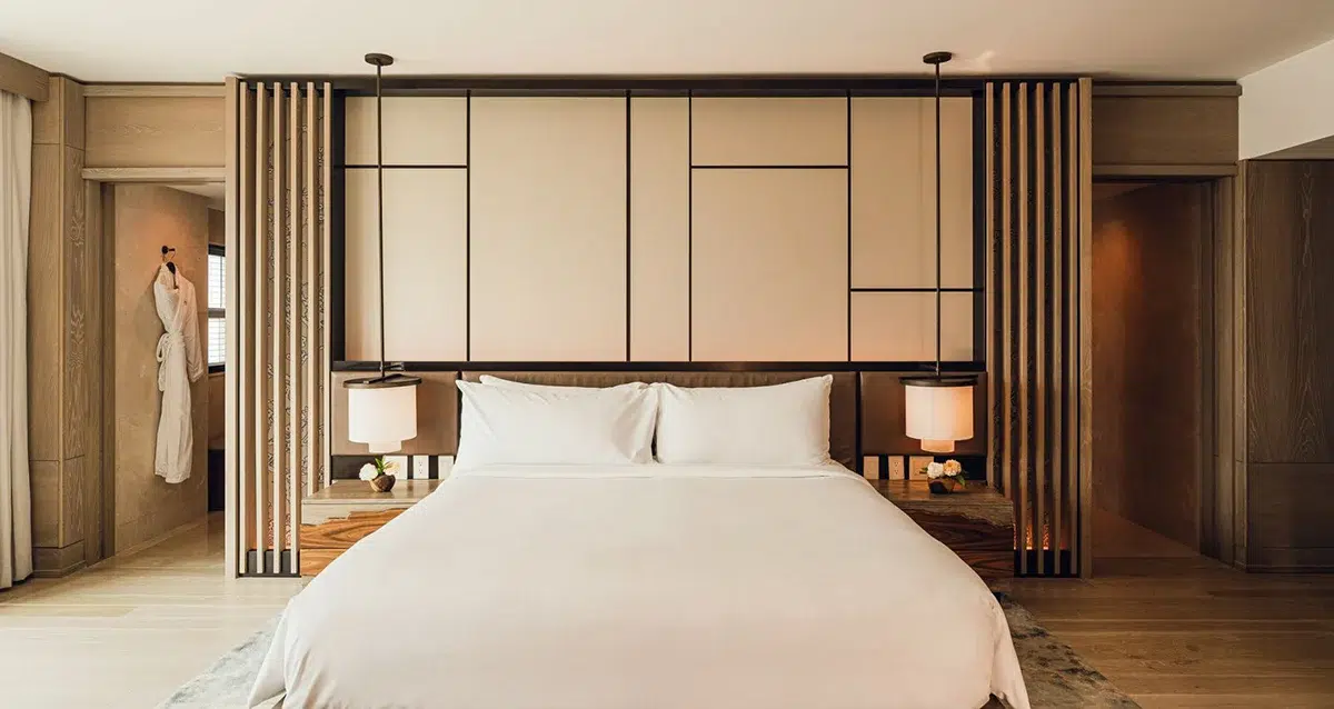Separated from the main property, the Bungalow Penthouse is a private retreat above the ocean. The 2,588-square-foot bi-level suite offers five balconies and a rooftop plunge pool. Inside, light woods, soft whites, and open spaces create a breezy coastal feel. A marble soaking tub and custom Le Labo amenities enhance the experience. Nightly rates start at $9,429.