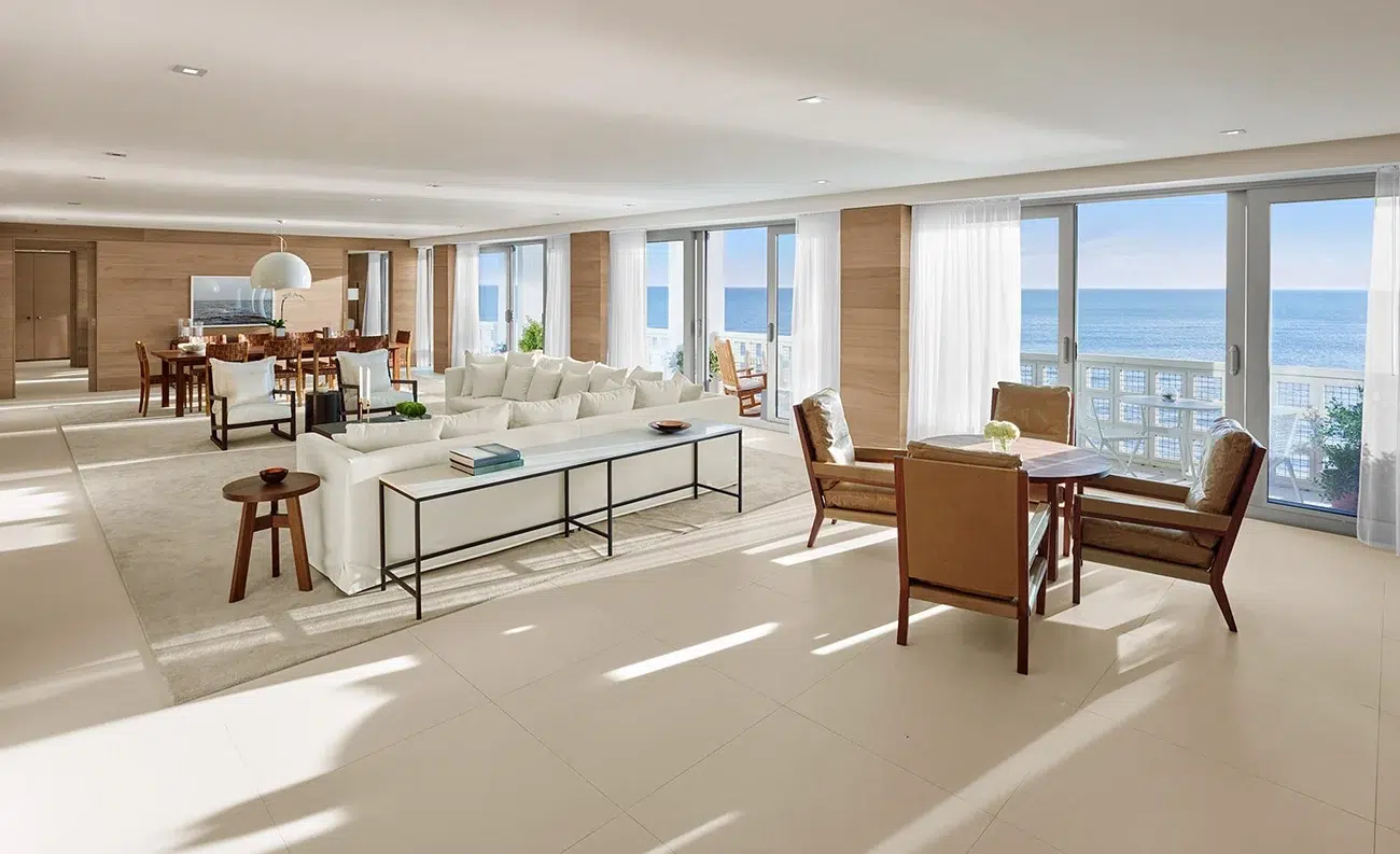 The 2,680-square-foot Presidential Suite at The Ritz-Carlton Key Biscayne offers modern island luxury. Two bedrooms, two marble bathrooms, and large terraces open to sweeping ocean views. Guests enjoy Club Lounge access and the natural light that fills every corner. Rates start at $6,999 per night.
