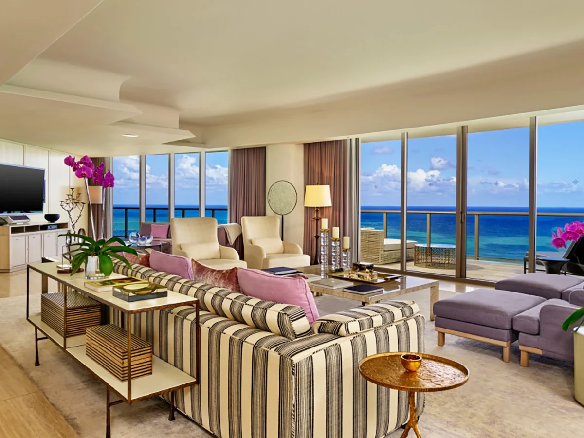 Perched on the 24th floor, the Presidential Suite at The St. Regis Bal Harbour defines coastal elegance. A private elevator opens to 2,800 square feet of serene luxury. The suite features two bedrooms, a media room, and a full kitchen. Expansive glass doors lead to a 1,200-square-foot wraparound balcony with ocean views. Guests also enjoy St. Regis Butler Service and a private poolside cabana. Rates begin at $6,000 per night.