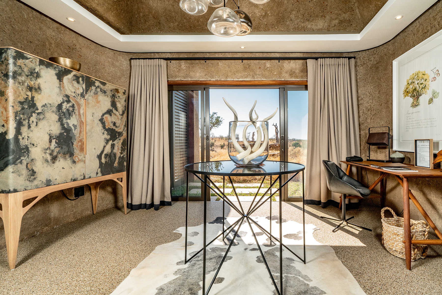 South African design firm Dakota Designs was tasked to breathe new life into the suites, while seamlessly blending the architectural masterpiece into the surrounding environment with the use of skillfully selected materials and textures that are in total harmony with nature. As I enter my suite, I am astounded by the eclectic mix of furnishings and finishes – a bespoke slate drinks cupboard with a beautiful exterior and interior, an arrangement of kudu horns in a glass vase, a leather headboard capped with a flight of handcrafted metal birds and a closet with weathered copper rails to hang your clothing.