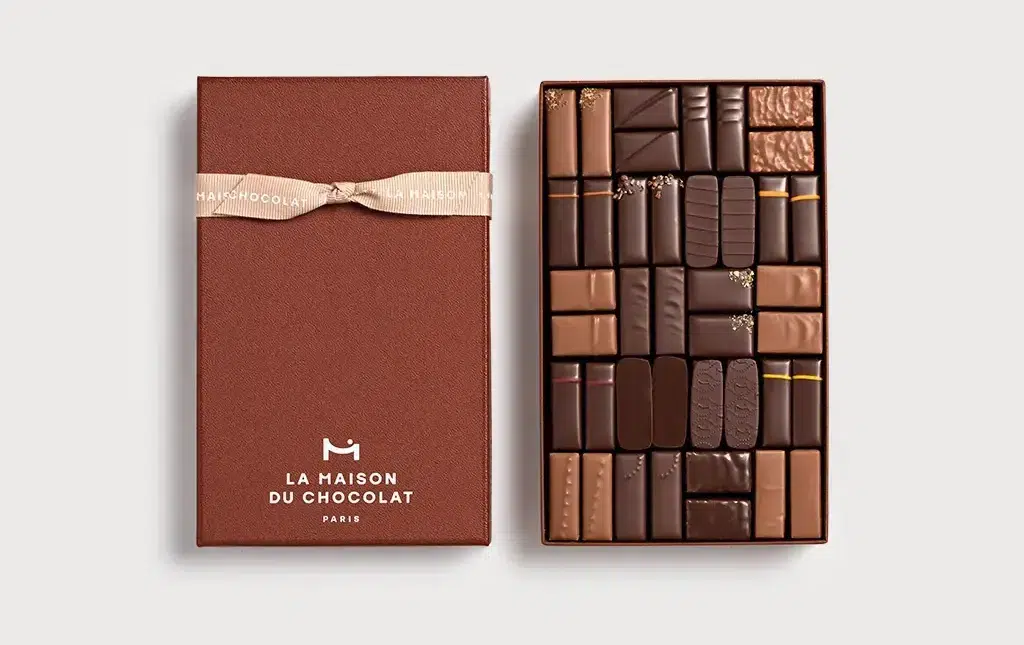 Parisian elegance finds its expression at La Maison du Chocolat, where Robert Linxe’s legacy continues through meticulously balanced pralines and ganaches. The Heart Collection — presented in boxes reminiscent of vintage saddle trunks — marries timeless craftsmanship with contemporary sophistication, offering a tactile sense of occasion even before the lid is lifted.