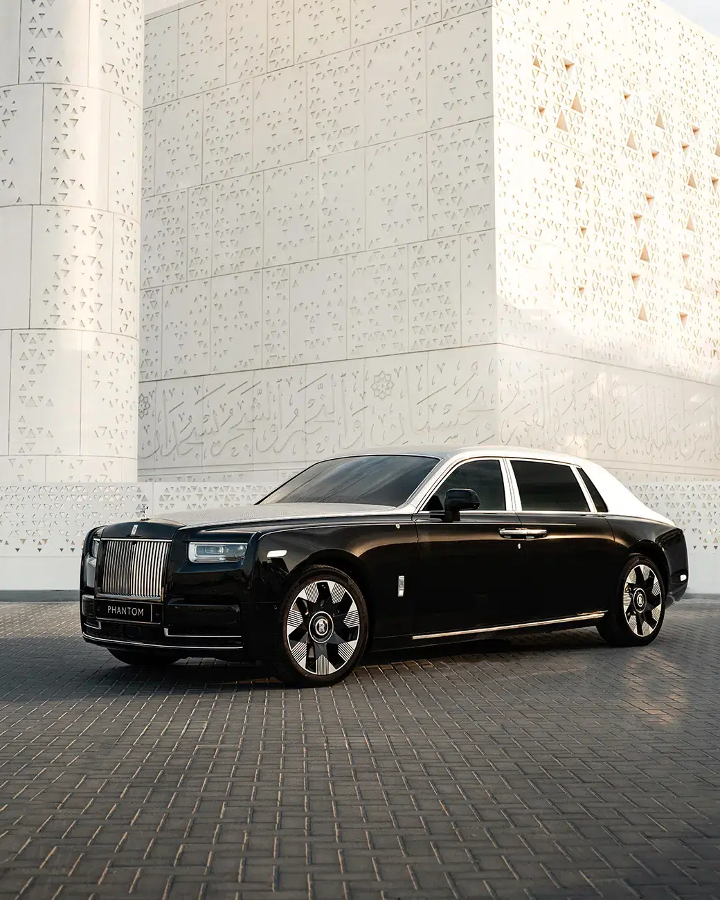 Finished in a two-tone Bespoke palette of Diamond Black and Silver, the exterior’s restrained elegance is complemented by a hand-painted coachline adorned with a subtle mashrabiya motif. An illuminated Pantheon grille framed in Dark Chrome, an uplit Spirit of Ecstasy, and part-polished 22-inch alloy wheels complete the visual composition — details that speak to Rolls-Royce’s evolving design vocabulary while remaining unmistakably Phantom.