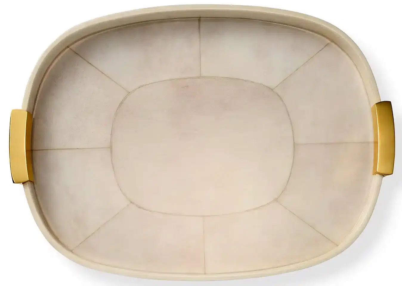 The Livio Parchment Serving Tray ($750) captures the glamour of relaxed entertaining. Wrapped in parchment-embossed leather and finished with a high-gloss lacquer, it has a polished presence that elevates any setting. Polished brass handles provide a refined accent, while the softly varied finish ensures that each tray feels unique. Used for cocktails or styled on a coffee table, it adds a sense of quiet sophistication to any room.