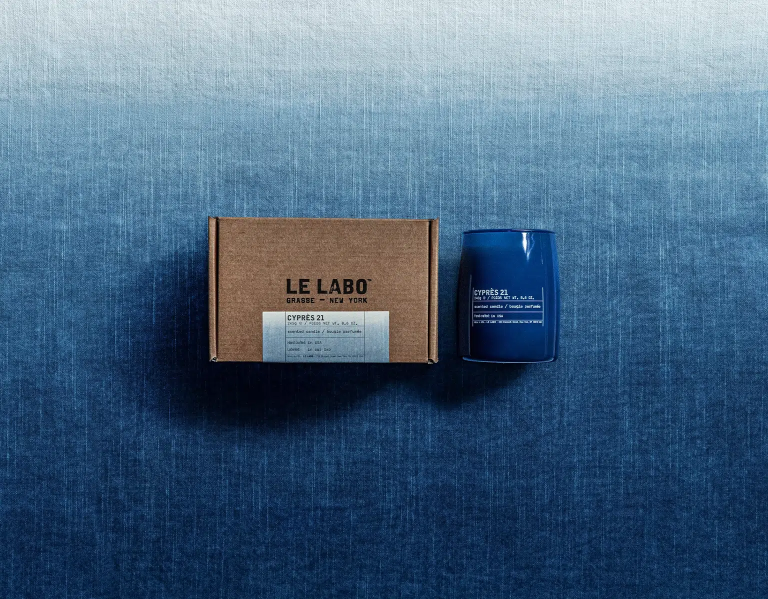 This collaboration has been central to the design of the special edition candle. CYPRÈS 21 INDIGO is presented in a deep blue vessel, paired with a custom gradient label that reflects the tactile beauty and organic variation of indigo dyeing. It feels considered rather than ornamental, a visual echo of a process that values restraint and repetition over novelty.