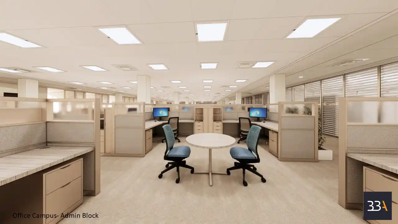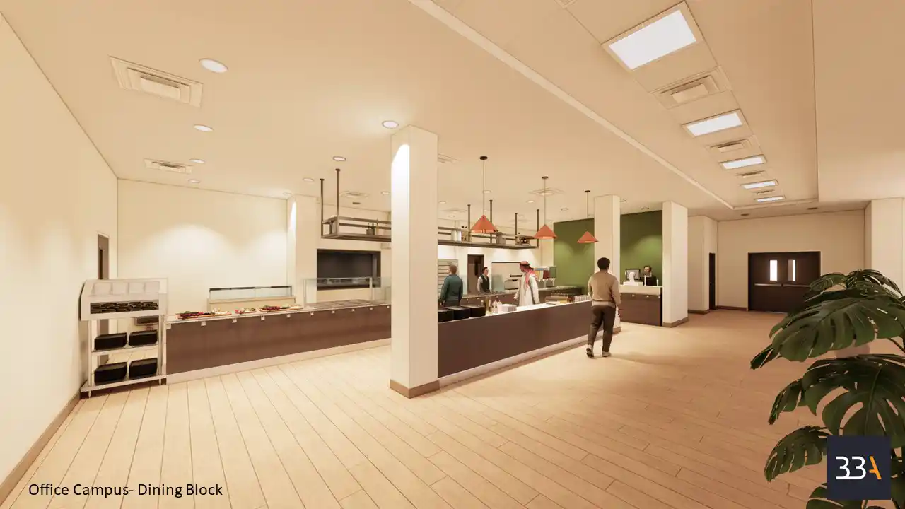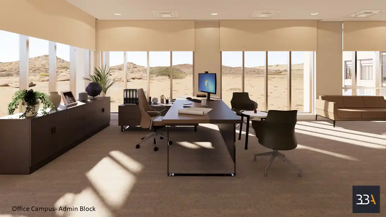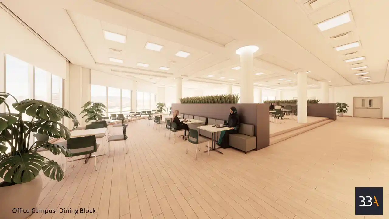 Another one of their projects is the work that they did on an Aramco office campus design, delivered in collaboration with Sino Hydro. The scope encompasses the interior of multiple buildings, including the Administration Block and the Dining Block. The project required establishing a cohesive design language across the campus while maintaining the distinct functional identities of each facility. The result demonstrates BBA’s capability to deliver sophisticated, industrial-inspired designs at scale, underscoring the firm’s strength in managing complex, large-format environments.