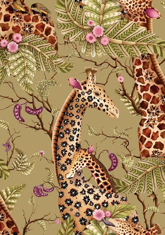 Royal Giraffe is where these sensibilities meet. The illustration carries Ardmore’s expressive line work and reverence for wildlife, while Cole & Son’s mastery of surface, scale, and print execution ensures the design feels architectural rather than illustrative. The result is a wallpaper that reads as composed, intentional, and enduring.