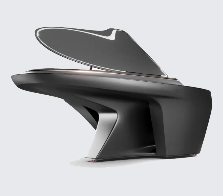 The piano’s form is unapologetically modern. A matte black body anchors the piece, while glass and metal elements introduce lightness and contrast. From certain angles, the rear appears to float, an illusion borrowed directly from automotive rear-end design, where weightlessness and motion are implied even at rest. Hidden compartments respond to touch, eliminating visible hardware and preserving the instrument’s sculptural purity.