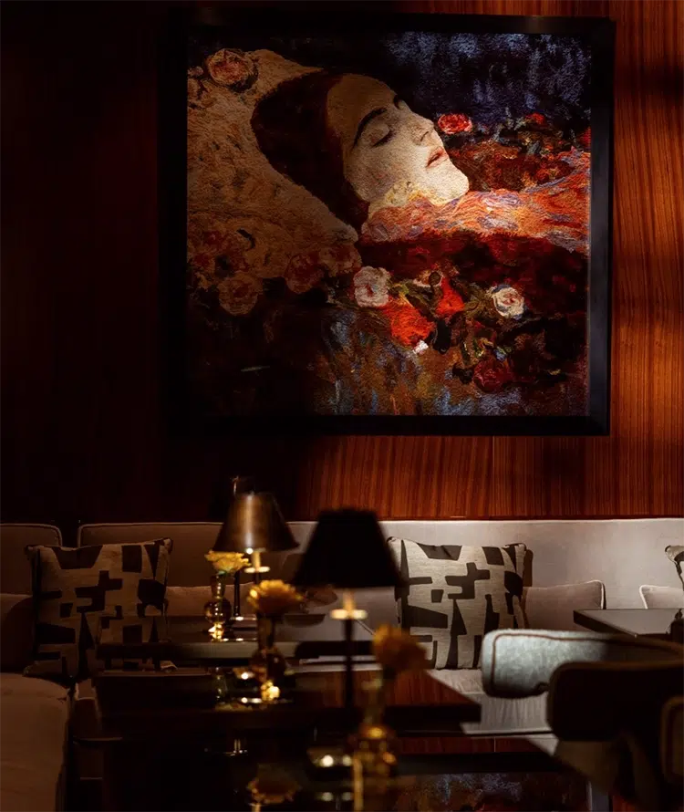 The linchpin of the collection is a tapestry of fashion icon Kate Moss by portrait artist Chuck Close, which takes center stage in the hotel’s lobby. Close has created portraits from countless media, most notably his work has been included in tapestry, a classical and difficult medium, possessing Close’s signature tension between abstracted units and a legible, unified surface.