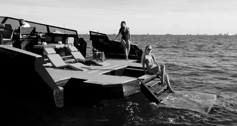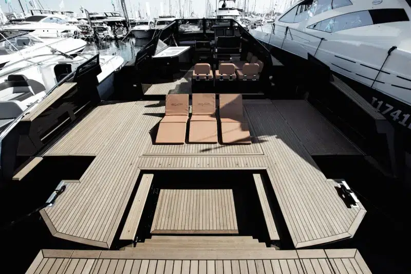 Also, technology does play a major role in EVO design and production. From its touch screen-controlled “XTension” borders, broadening the beam of both the aft deck and swim platform at the touch of an iPhone or iPad, to its fold-away cleats, anchor, and fender hook, EVO Yachts incorporated many useful technological applications for user-friendly ease. As the rear deck expands 40% to 270 s.f. in 30 seconds, recessed lounges rise from the floor, and steps drop to offer water access without danger from engines or propellers. A lower, stable step, the “Transformer” can rotate, support people, lower water toys or equipment into the water, or be raised to create a dive platform.
