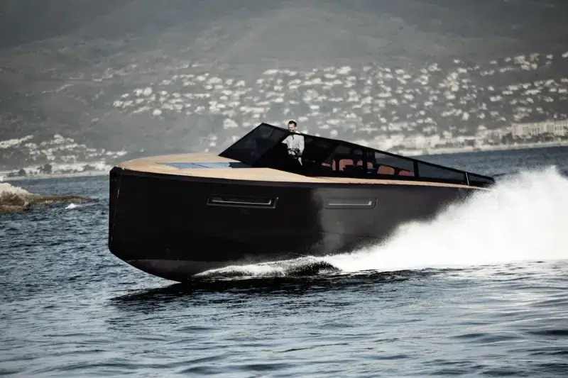 Clear Plexiglas steps offer a futuristic descent to the air-conditioned lower deck with a 46” LCD 3-D TV, disguised as a mirror, two large cabins, a designer head and shower with yacht-like fixtures. For the U.S. model, a leather storage locker in the salon becomes a column housing a microwave and refrigerator, creating a mini galley; the dining area can seat 12 around a teak table, which then recesses to the floor or can become a king-sized berth. To port, another double cabin invites friends for overnight stays.
