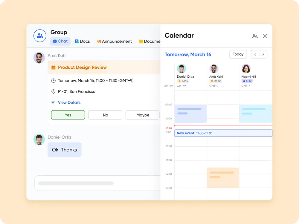 Scheduling is one of the hardest challenges for global teams. Meetings often exclude someone, deadlines get confused, and time differences create unnecessary tension. Lark Calendar helps by creating shared visibility across regions. Teams know exactly when deadlines fall, who is available, and how recurring approvals fit into the bigger picture. By turning time zones into a managed variable instead of a constant obstacle, Calendar keeps projects aligned.