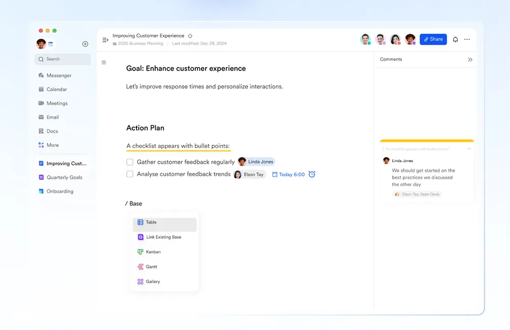 Documents are at the core of global collaboration. Yet when files are emailed back and forth, versions multiply, context gets lost, and people aren’t sure which copy is final. Lark Docs eliminates this problem by giving teams a single, living space to draft, edit, and finalize content together. Teams in different countries can work in real time or asynchronously, and all contributions are tracked. This keeps global collaboration efficient and trustworthy.