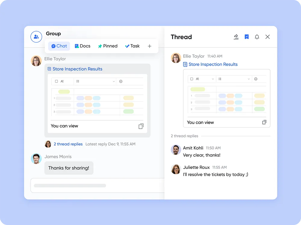 Threaded replies: prevent conversations from splintering or being lost in the noise.