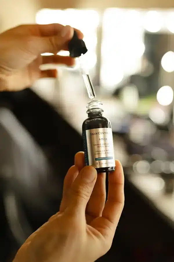At the centre of the routine, Akrim applied P-Tiox serum using deliberate lifting strokes across the forehead, eye contour, and nasolabial folds. The peptide-driven formula smoothed the complexion while supporting deeper structural resilience. Consequently, makeup enhanced rather than concealed the skin. The finish appeared rested, subtly sculpted, and luminous without excess shine.