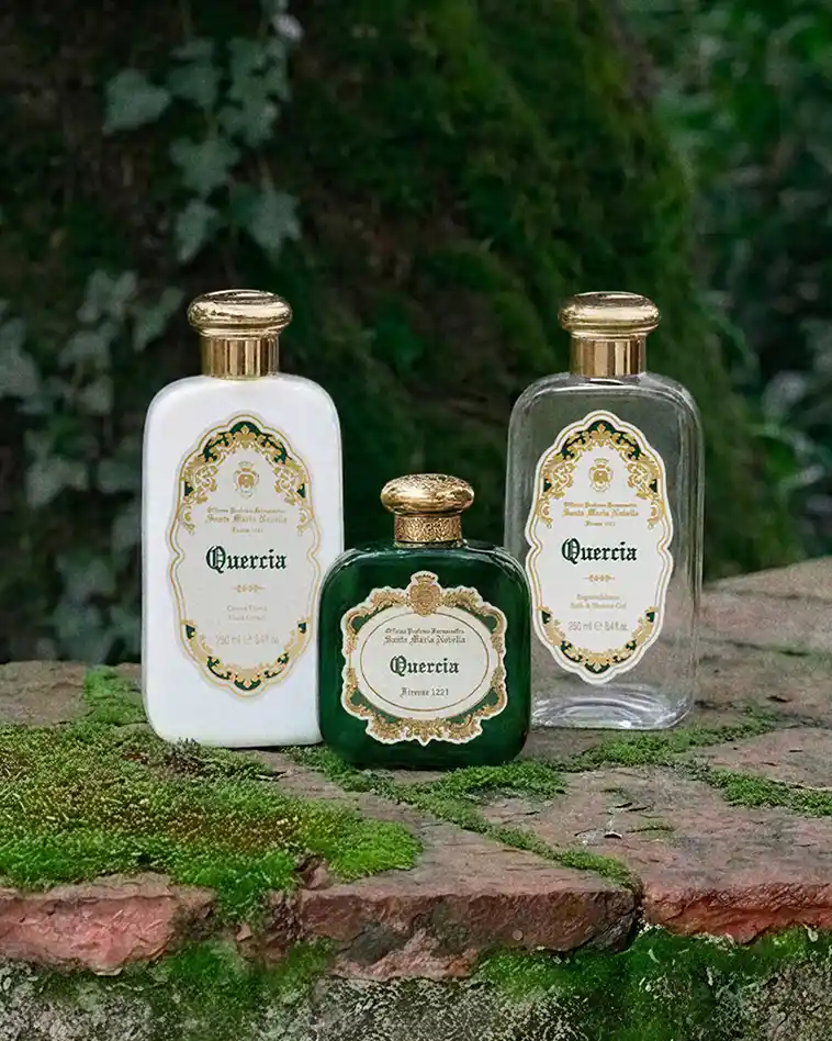 Each fragrance in the collection centers on a botanical identity tied to this Florentine heritage. Two compositions from the line—Acqua and Quercia—now appear in complementary body-care formats, including a Bath & Shower Gel and a Fluid Cream.