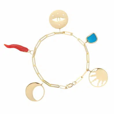 Handmade in Manhattan’s Diamond District, Gazza Ladra’s collections feature 18k gold jewelry alongside charm bracelets rendered in lighter gold compositions. The designer’s commitment to local production reflects both a dedication to craftsmanship and a conscious effort to reduce environmental impact. Symbols such as protective eyes, phoenix pendants, sun-and-moon charms, and recycling motifs reflect a broader philosophy, jewelry as a carrier of personal intention and cultural memory.