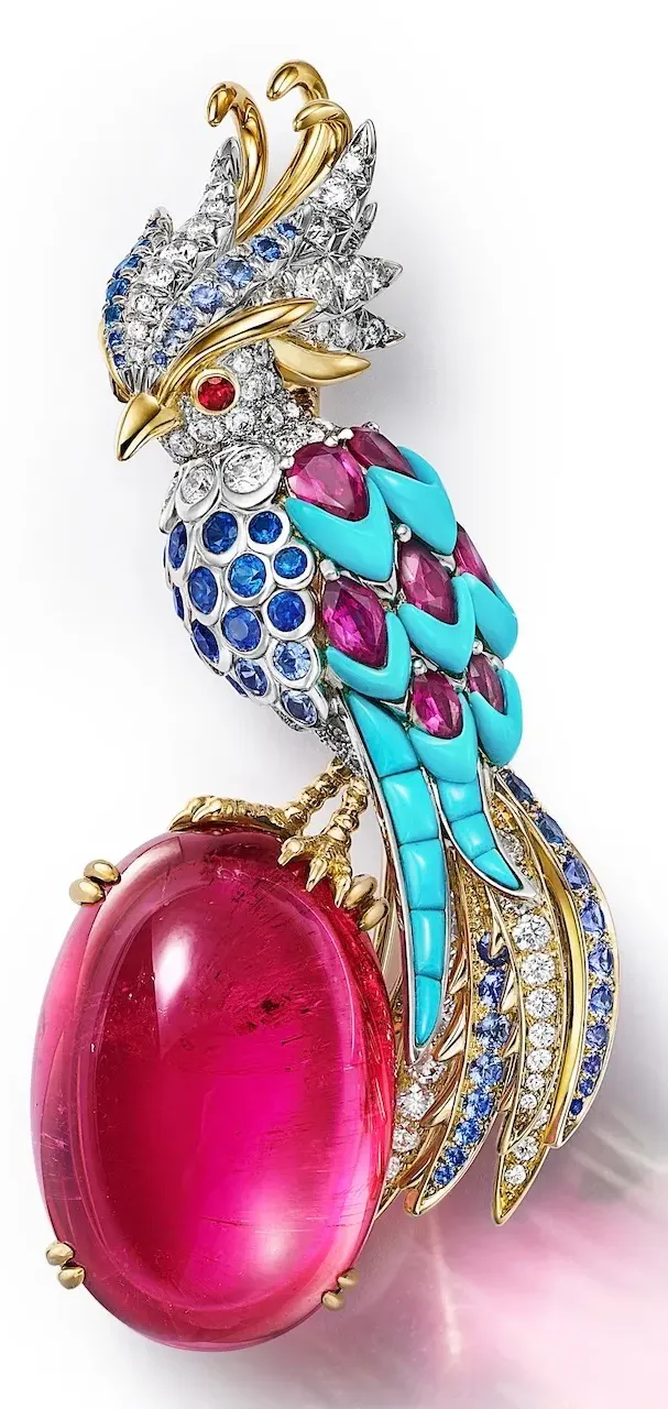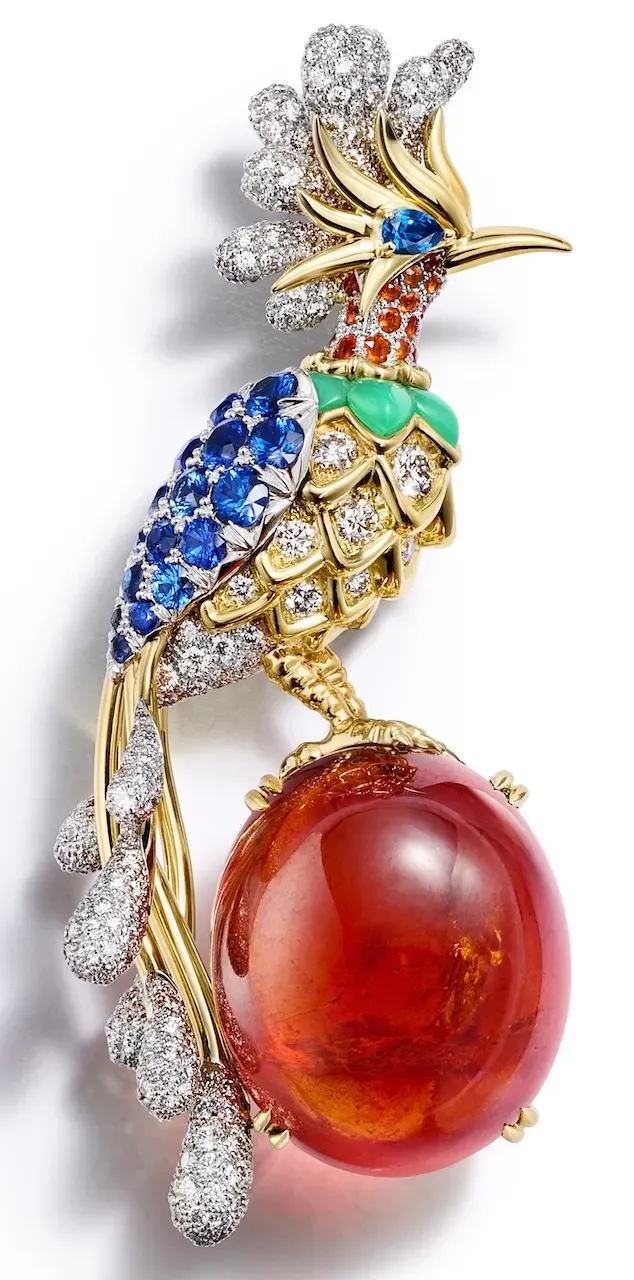 Rendered in vivid combinations of fire opals, emeralds, and sapphires, each piece becomes an exercise in balance between color and structure. These are not decorative objects, but compositions that suggest motion and presence. The birds appear animated, their jeweled forms capturing a moment just before flight.