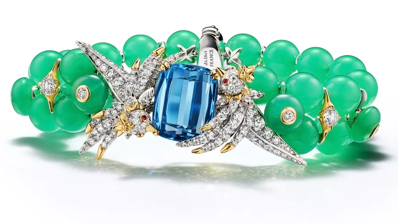 The iconic Bird on a Rock returns with renewed vitality, now poised atop luminous Brazilian aquamarines and framed by vivid chrysoprase. The composition feels suspended in motion, capturing a fleeting moment rather than a fixed form—an approach that defines the collection as a whole.