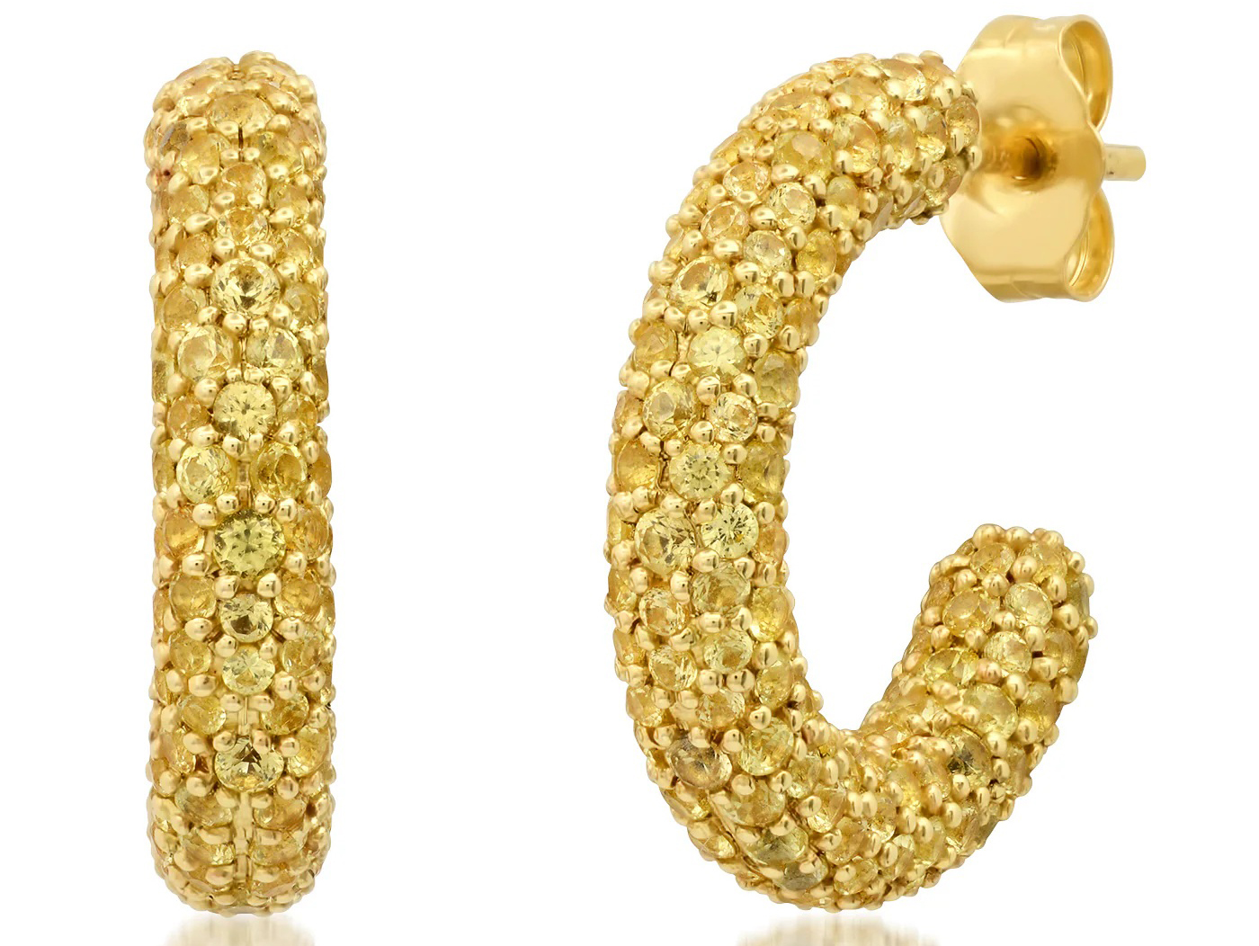 The 14K Gold Mini Sunshine Party Hoops in yellow sapphire are a new sparkly spin on the classic Eriness party hoop design, featuring pavé-set yellow sapphires. Whether attending a party in person or sauntering down the pasta aisle in the supermarket, these minis might be smaller, but they still make a statement, even from six feet away.