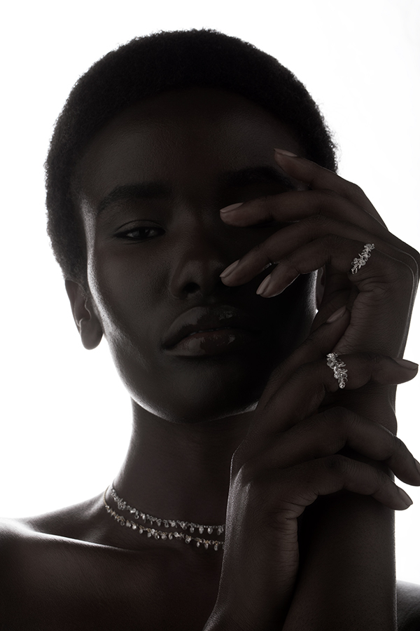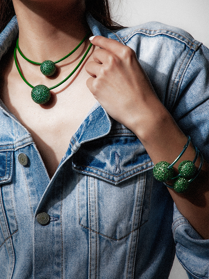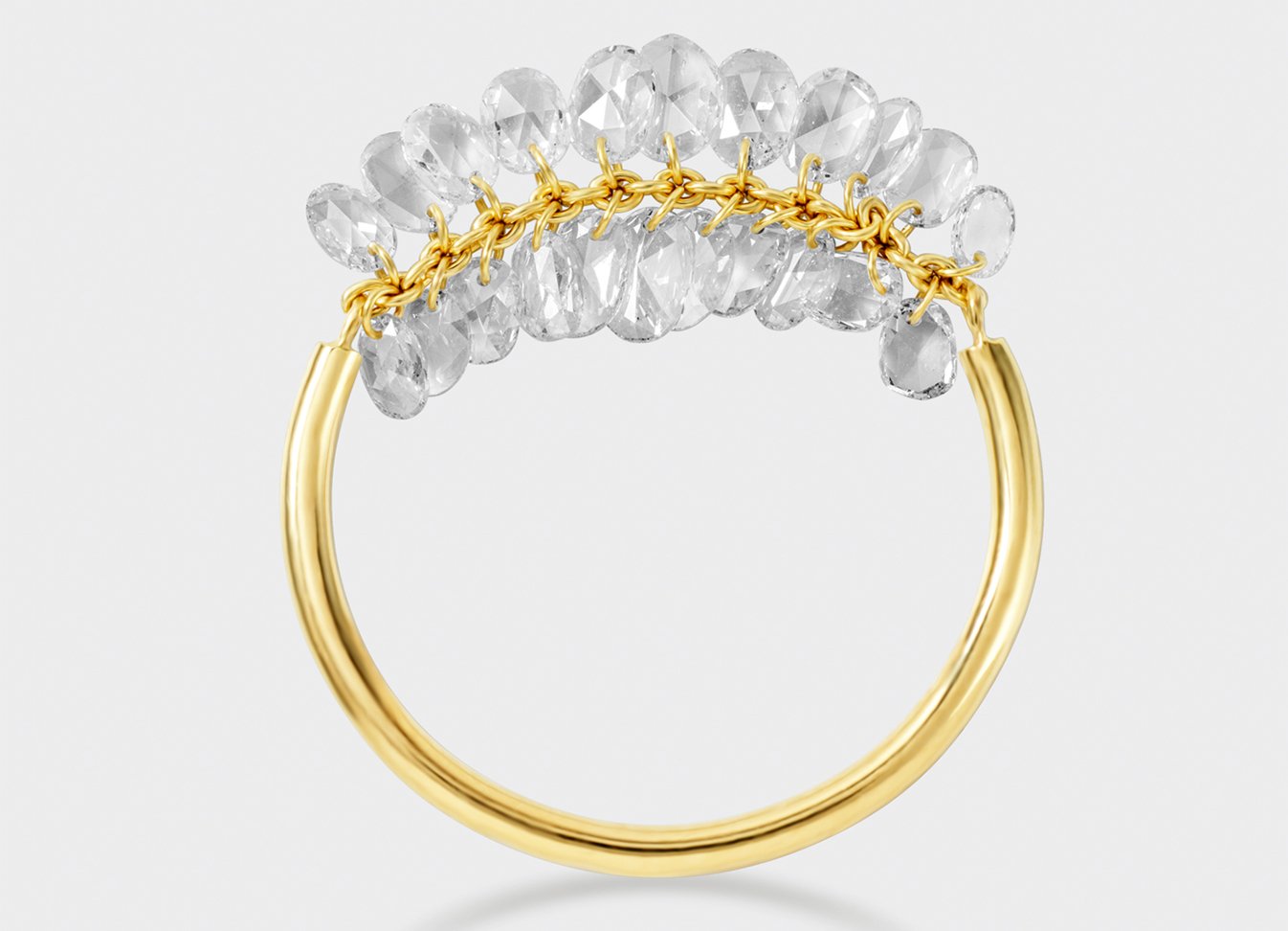 Take Disco Bug, a high-color, high-energy homage to Shweta’s childhood memory of a spinning disco ball. “When people see Disco Bug, they immediately associate it with us,” says the designer. “To achieve that in just a year is surreal.” Bold silhouettes, sculptural forms, and gemstone flashes evoke light, rhythm, and joyful contrast across the Disco Bug titanium collection released in 2024. The collection includes rings, necklaces, bangles, and snug-fitting earrings — encrusted with tsavorites, sapphires, or amethysts. “Titanium’s not for everyone,” Shweta admits. “It’s for someone who’s already collected the classics — and now wants something a little more artistic, more expressive.” By contrast, Dew Drops, crafted in yellow and white gold, is a pared-down line inspired by misty Belgian mornings. Dew-speckled trees seen from the car window on the way to school sparked the idea for the jewelry. Shweta deploys strands of oval rose-cut diamonds to evoke the dew drops and to lend movement to the rings, bracelets, necklace, and earrings. “Organic curves, soft gleams, and quiet details capture the poetry of stillness,” remarks Chandni.