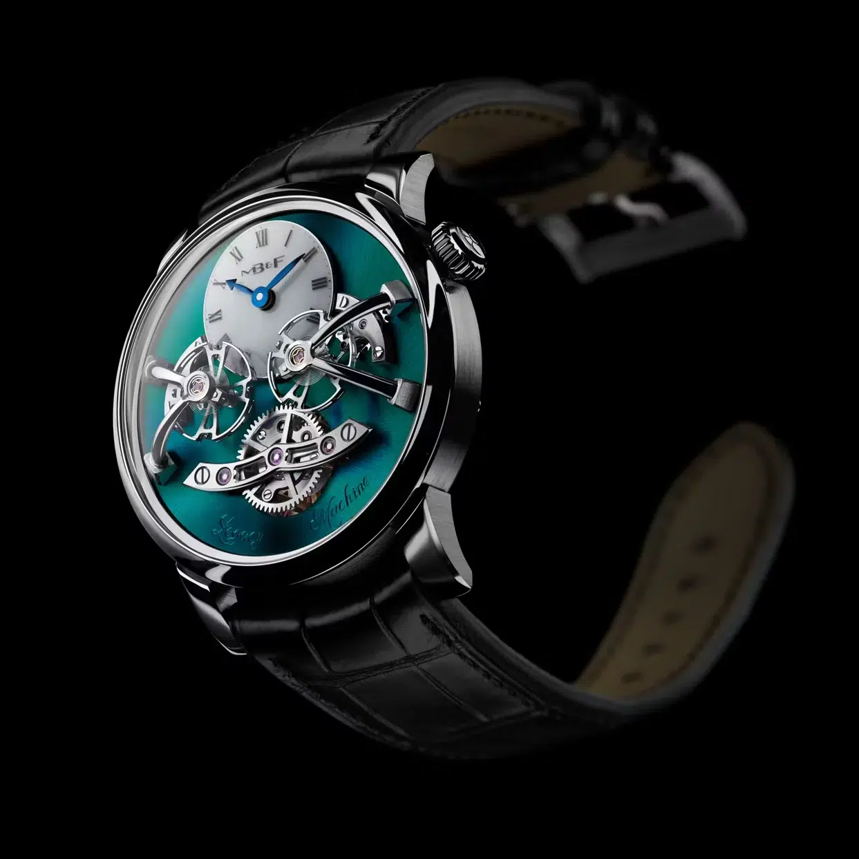 Crafted from Grade 5 titanium (Ti-6Al-4V alloy), the LM2 Titanium redefines lightness and strength through both form and feel. Yet, it’s the vivid blue-green dial—a hypnotic hue achieved through the same chemical vapor deposition technique as the famed LM1 M.A.D. Dubai—that truly captivates the eye.