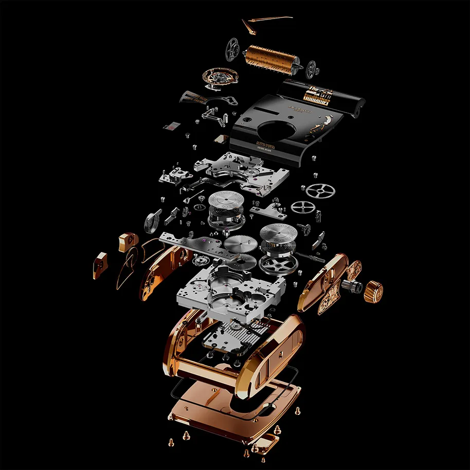 Supporting this acoustic architecture is an equally complex movement. The in-house calibre integrates more than 500 components, combining a flying tourbillon with a dual power reserve system. One barrel is dedicated to timekeeping, ensuring stability and precision, while a second is reserved exclusively for the musical complication, preserving the integrity of both functions.