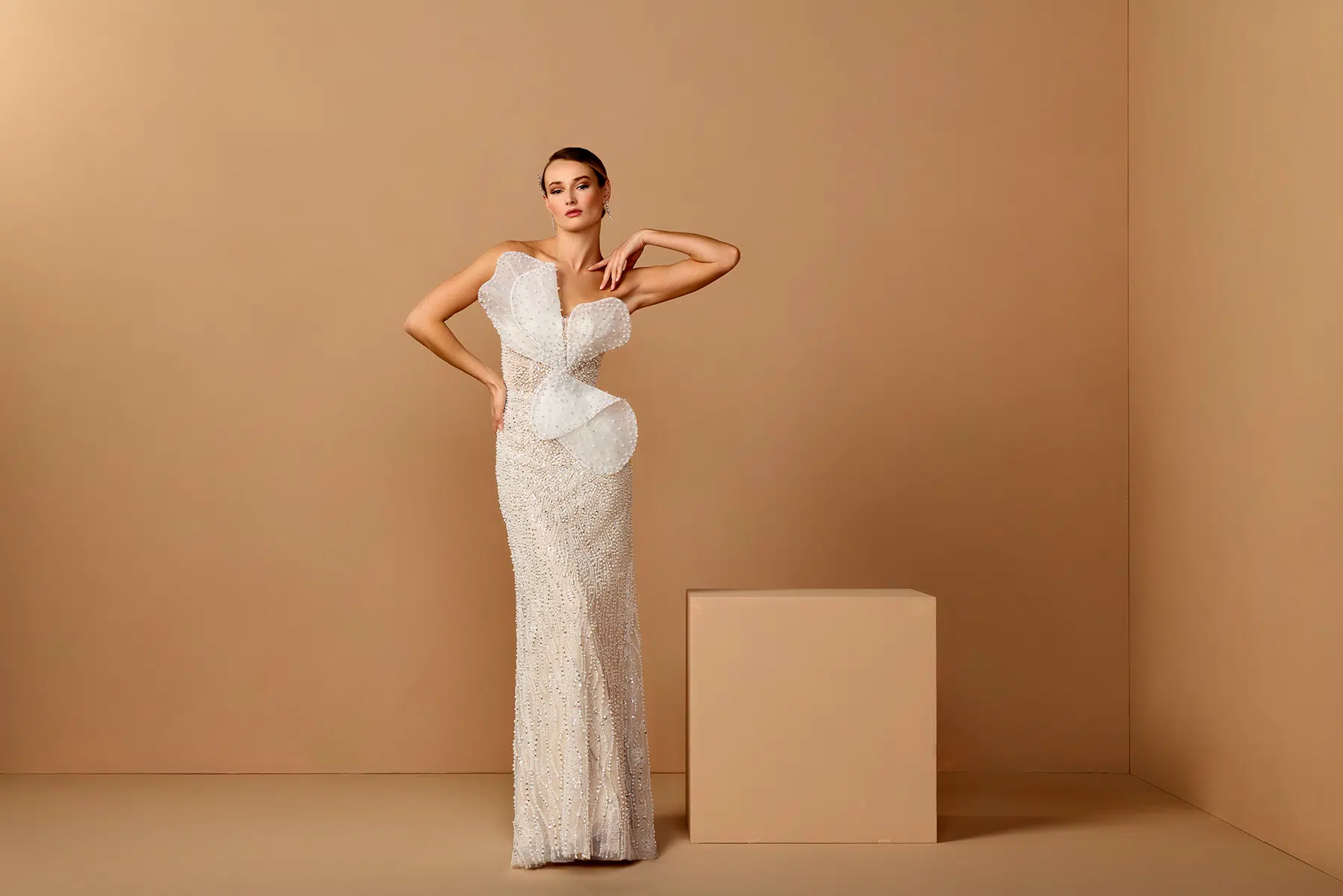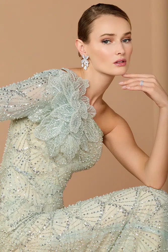 Luxurious fabrics form the foundation of the collection, while hand-applied embellishments add depth and movement. Feathers, sculptural beadwork, and richly saturated hues create gowns that shimmer with texture and presence—pieces designed not merely to be worn, but to define the moment.
