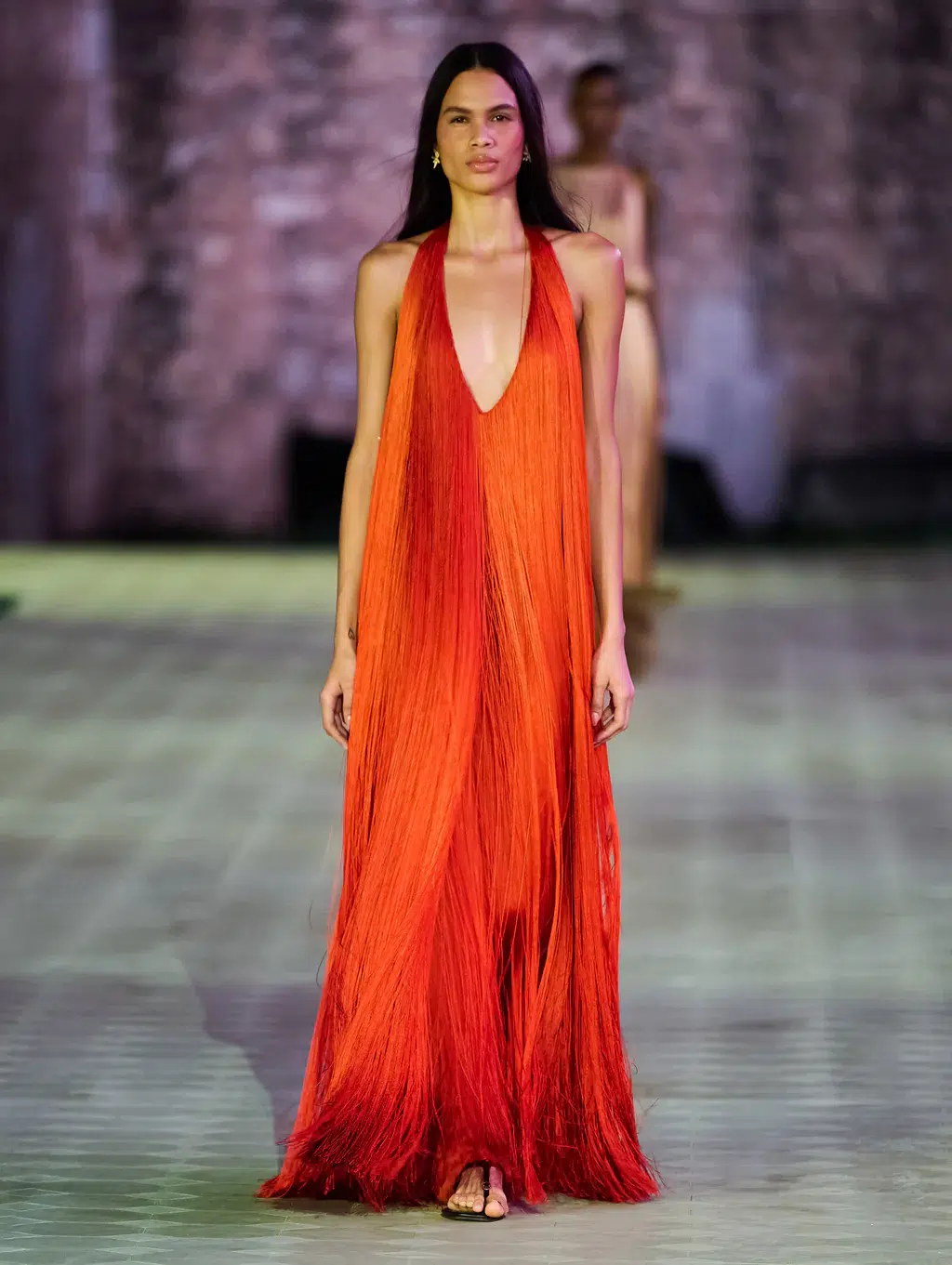 The palette was restrained and grounded, tamarind, saltwater blue, khaki, soft ivory, allowing form and surface to carry the narrative. Florals and palm-leaf motifs appeared not as decorative flourish, but as structural elements: chinoiserie-inspired prints, raffia and bugle-bead intarsia, and embroidered fringing that recalled artisanal processes more than seasonal styling.