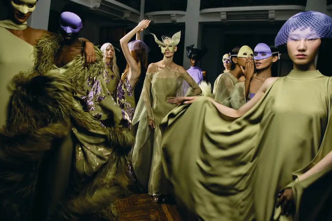 The house continues its work with family-owned silk mills in Como. Consequently, it produces dense jacquards and detailed fil coupé. Caftans take on sculptural form while staying fluid. Finally, bare shoulders, halternecks, and subtle cutouts introduce a controlled sense of allure.