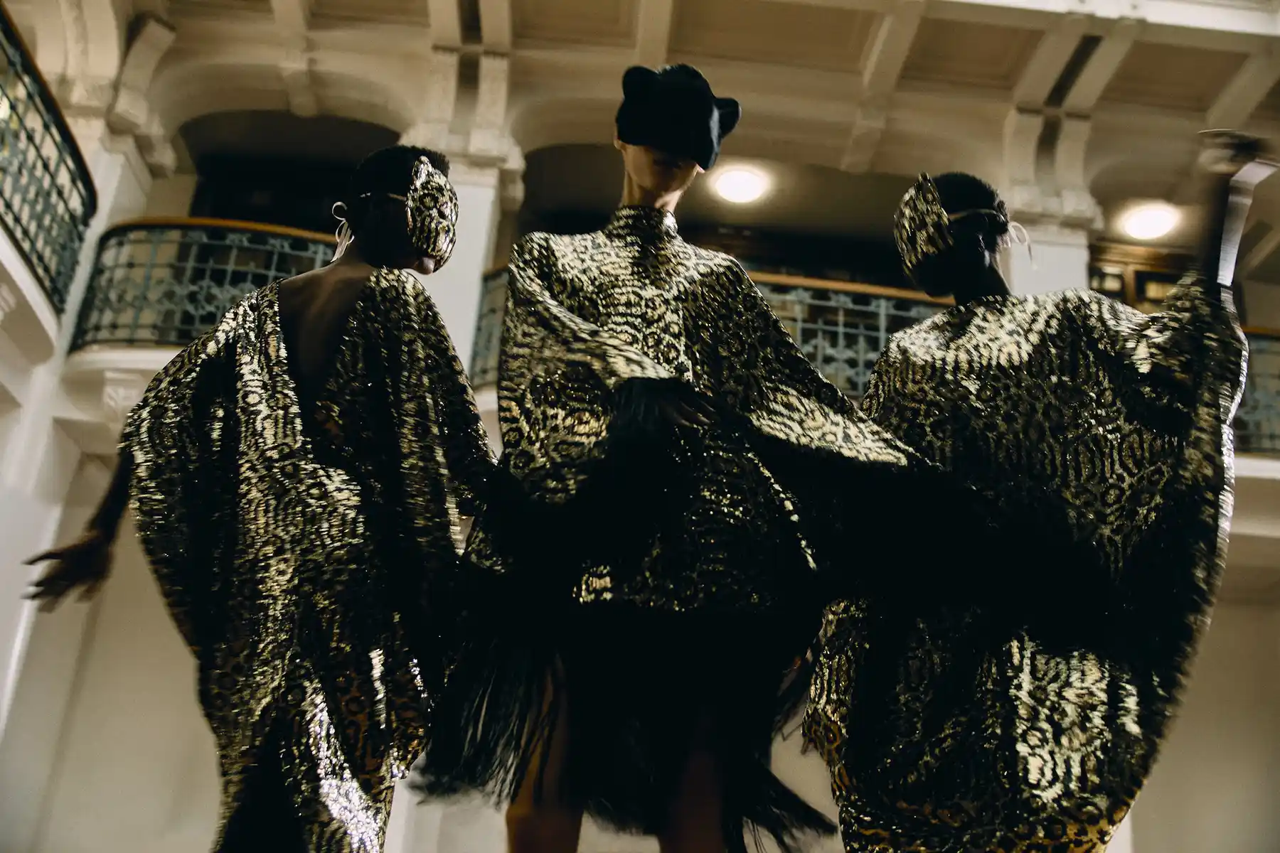 Fringe returns with purpose. In particular, lengths reach up to 60 centimeters and change how minis and caftans move. At the same time, balloon trousers reference Le Bal Oriental. Sequins appear in layered floral designs and in a one-shoulder gown finished with ostrich feathers. Among these, a black hammered organza gown with fringed gold embroidery stands out.