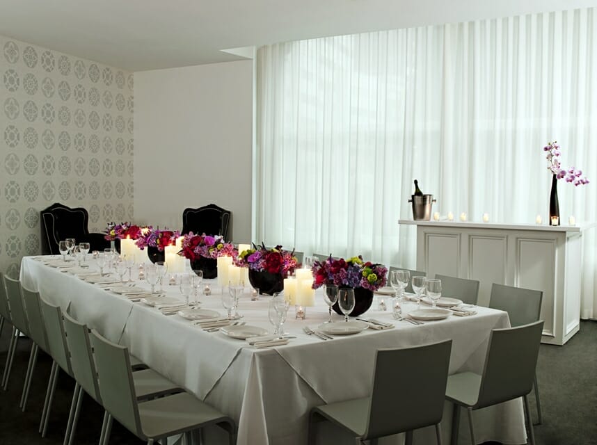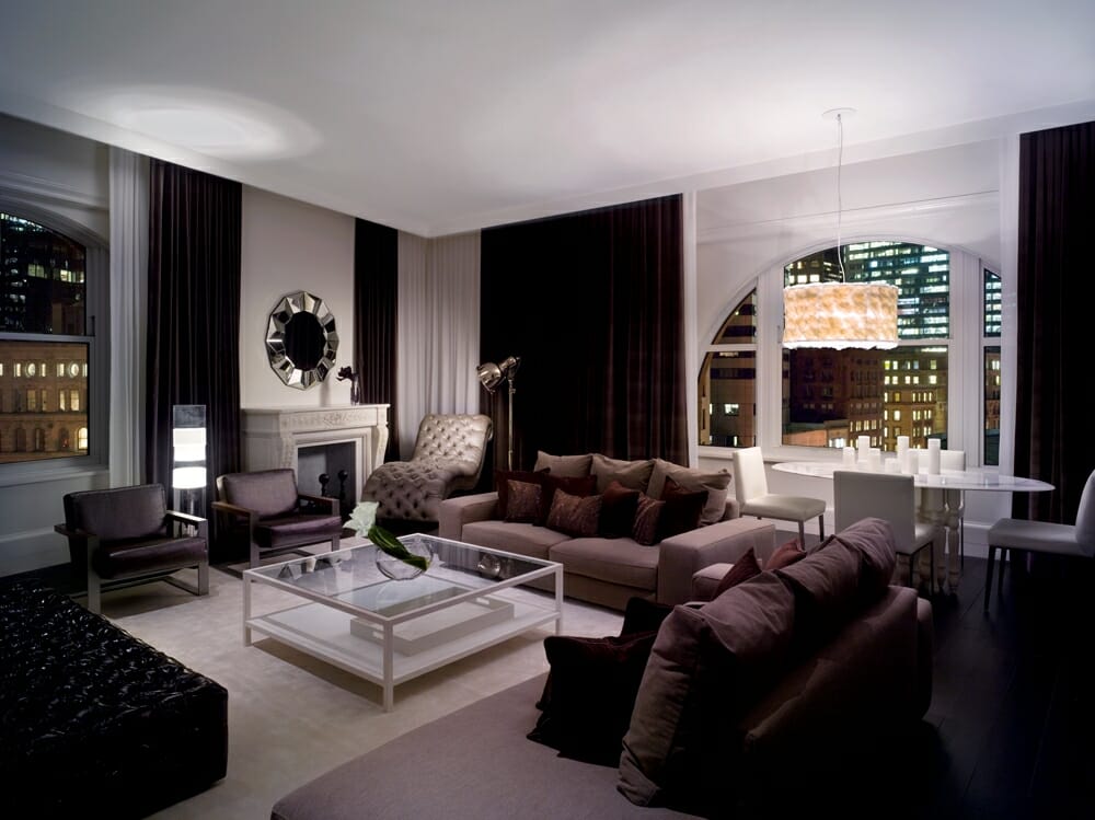 The sleek, minimalist décor is in perfect contrast to the historic architecture. The hallways are cast in a soft glow, and set the tone for relaxation among the busy city streets outside. The elevators open to reveal a gilded mirror which holds one of the many unexpected elements at AMES. Glance into the mirror and you will be transfixed by a “Pepper’s Ghost” illusion of a seemingly floating chandelier.