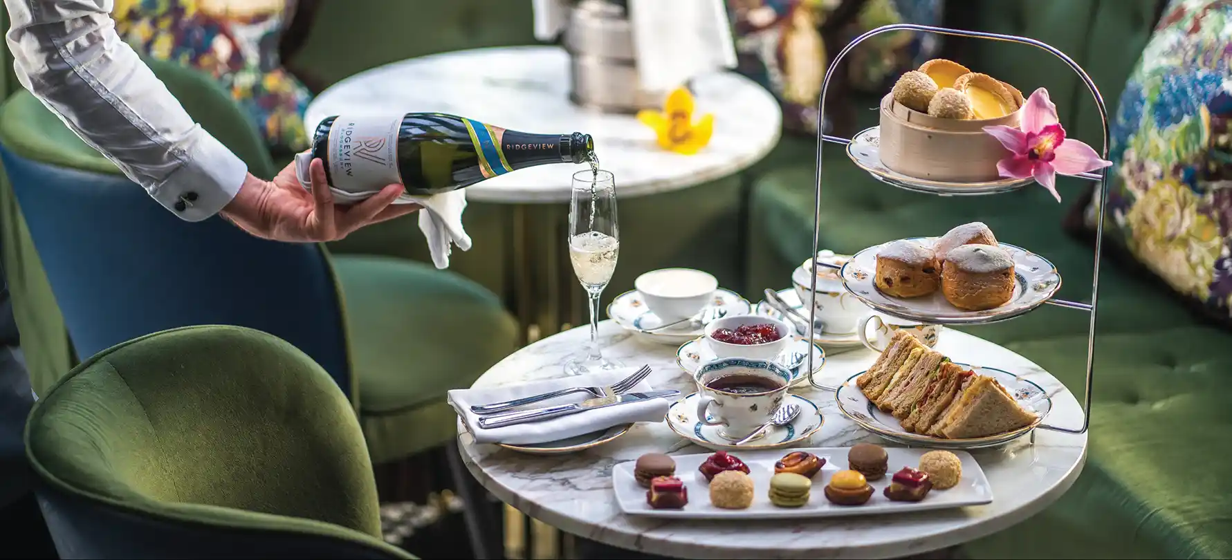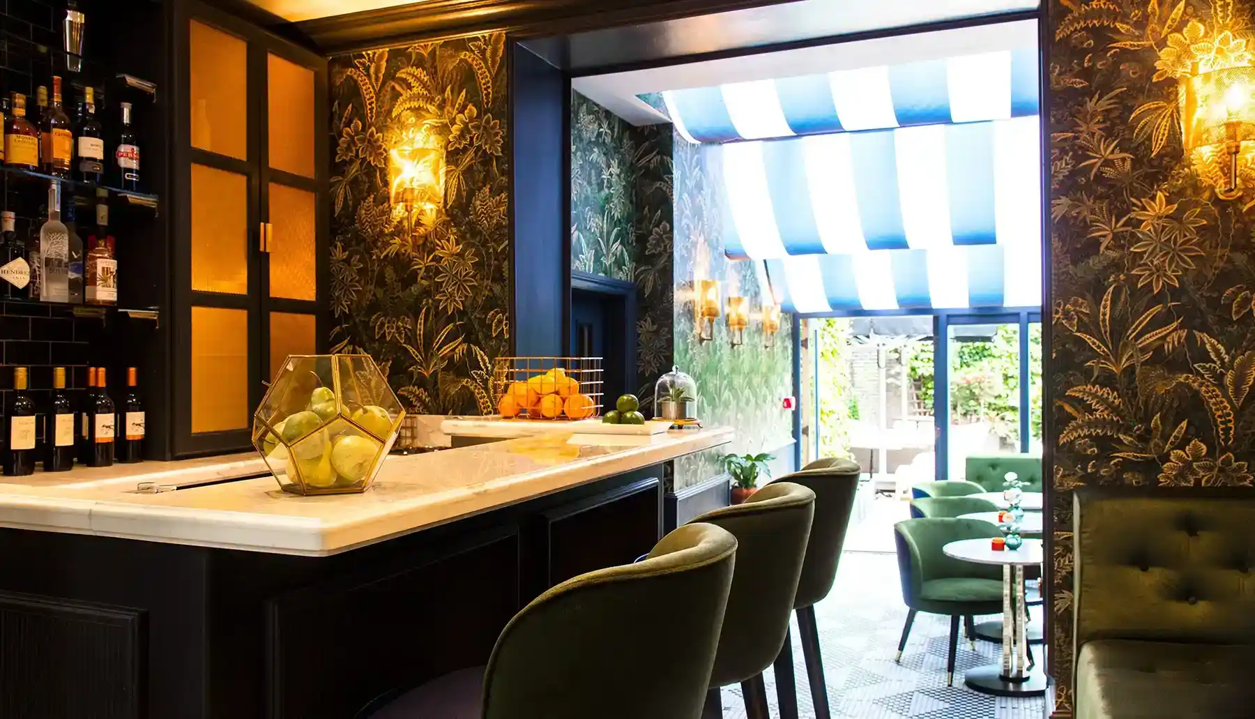 With its black and white tiled floor, fine grey walls, and ornate furnishings, the partially canopied ceiling of the Alchemy Bar is the hotel’s outstanding feature and, when good weather permits open onto an immaculate terrace – a tranquil garden courtyard in the heart of Bloomsbury. The resident cocktail waiter can rustle up a very impressive Tanqueray Bloomsbury Martini, a timeless classic that tastefully epitomizes a very classy and characterful hotel.