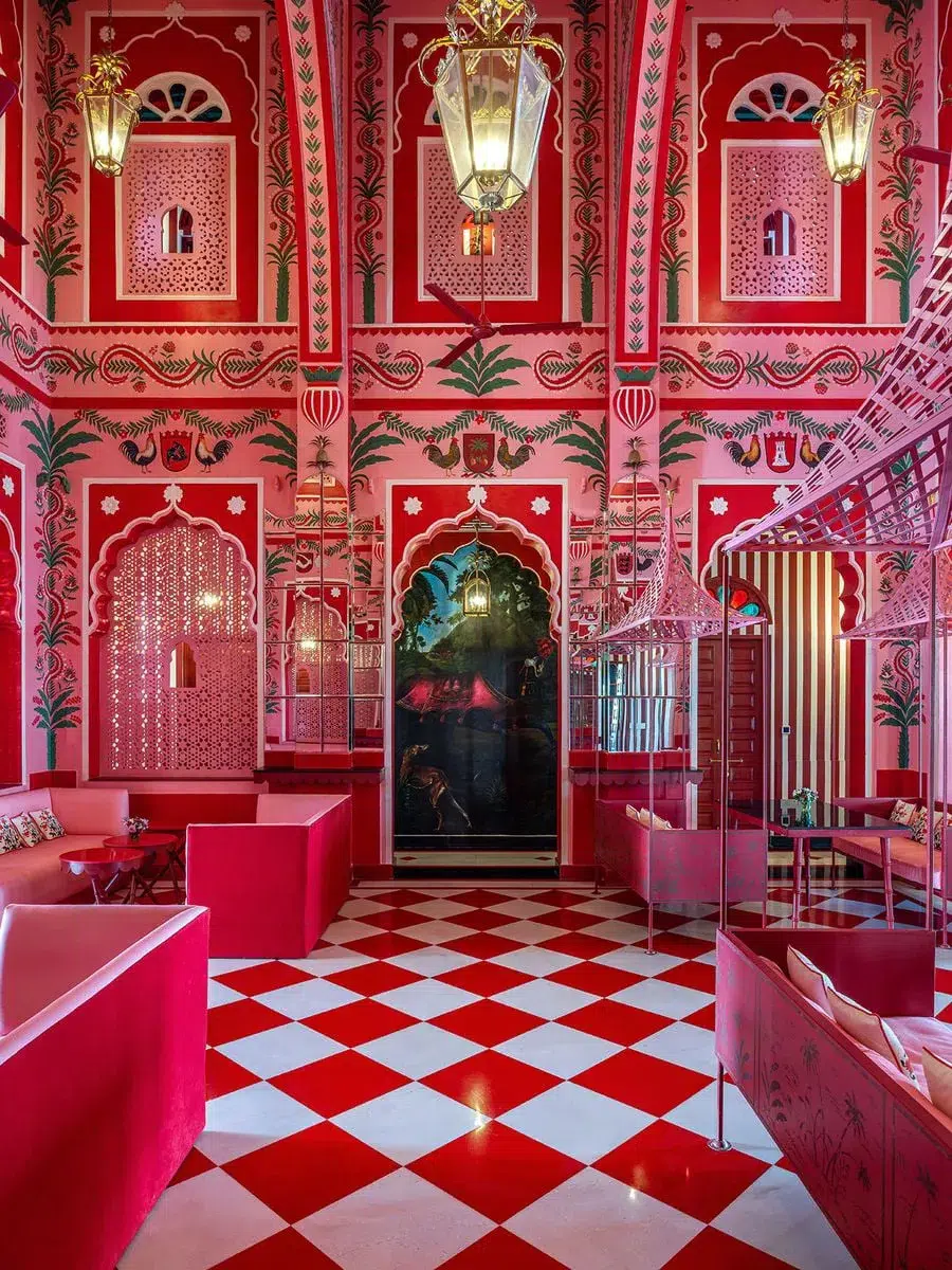 If Amet Haveli whispers, Villa Palladio sings. Saturated in lacquered reds, hand-painted stripes, and ornamental detail, the hotel is unapologetically expressive. Yet beneath the theatrical surface lies discipline—symmetry, repetition, and restraint keep the maximalism from tipping into excess.