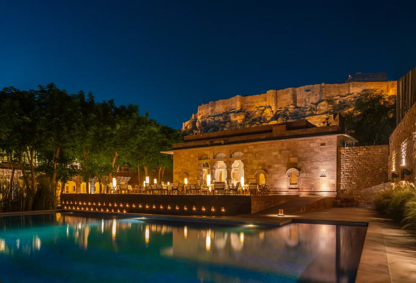 Set beneath the imposing Mehrangarh Fort, RAAS Jodhpur pioneered a new architectural language for Indian boutique hotels. Contemporary volumes in stone and glass stand in deliberate contrast to the ancient citadel above, creating one of the country’s most powerful visual dialogues between past and present.