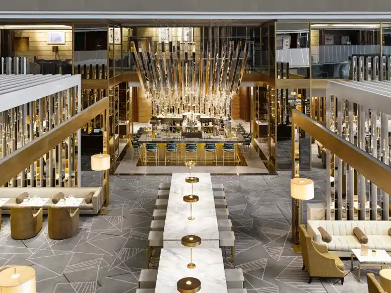 Recent renovations have reshaped the hotel’s arrival experience, beginning with a dramatic open lobby redesigned by Richmond Design Hospitality. Rising toward a soaring ceiling, the space pairs matte steel finishes with warm metallic accents inspired by the fluid lines of Spanish architect Santiago Calatrava. Local details, from cava-inspired lighting installations to geometric floor patterns reminiscent of Passeig de Gràcia, subtly ground the modern aesthetic in Catalan heritage.