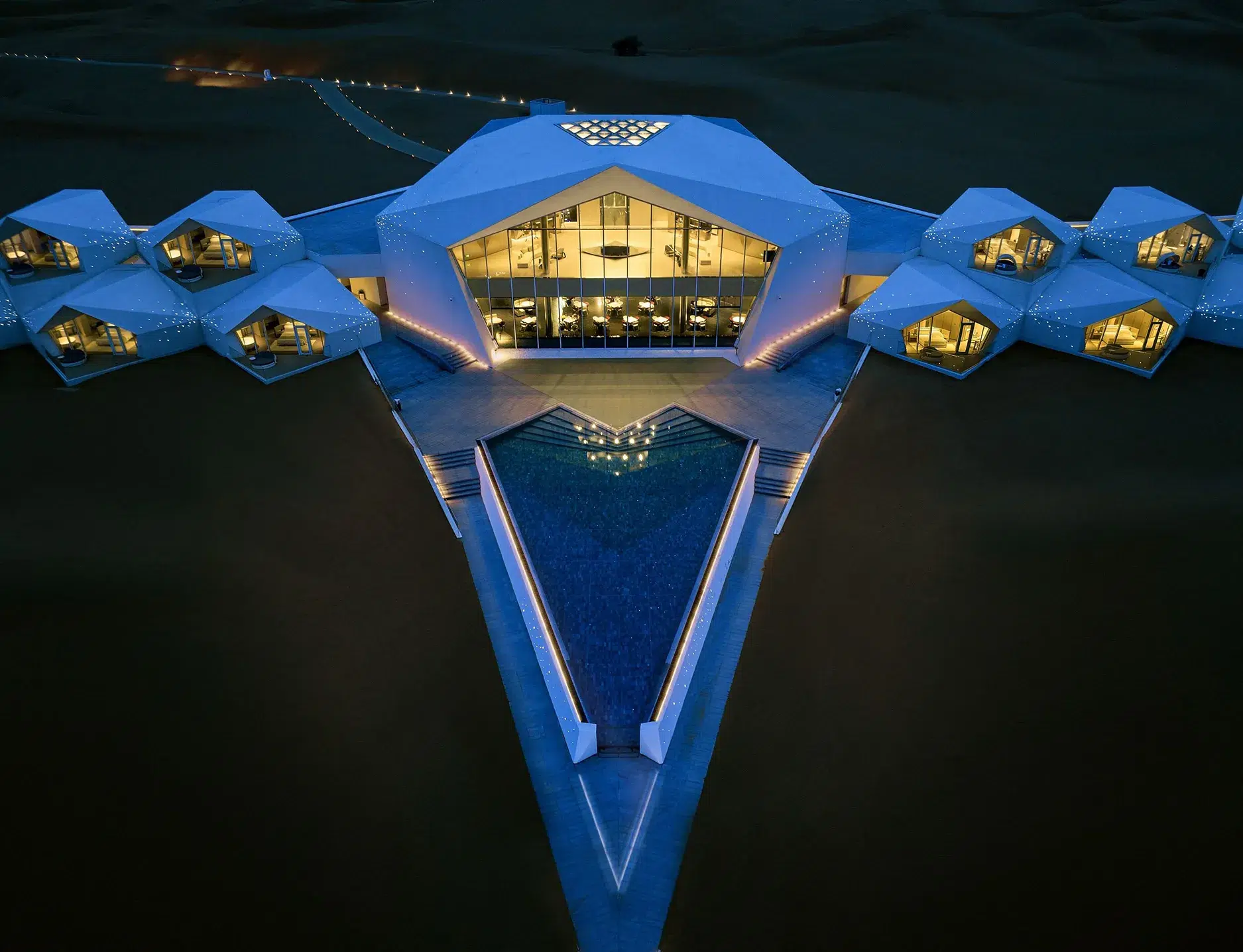 That principle finds its clearest expression at the Zhongwei Desert Diamond Hotel, a geometric composition set within the Shapotou Nature Reserve. From above, its faceted structures read as a deliberate intervention—precise, reflective, and calibrated against the vastness of the dunes.