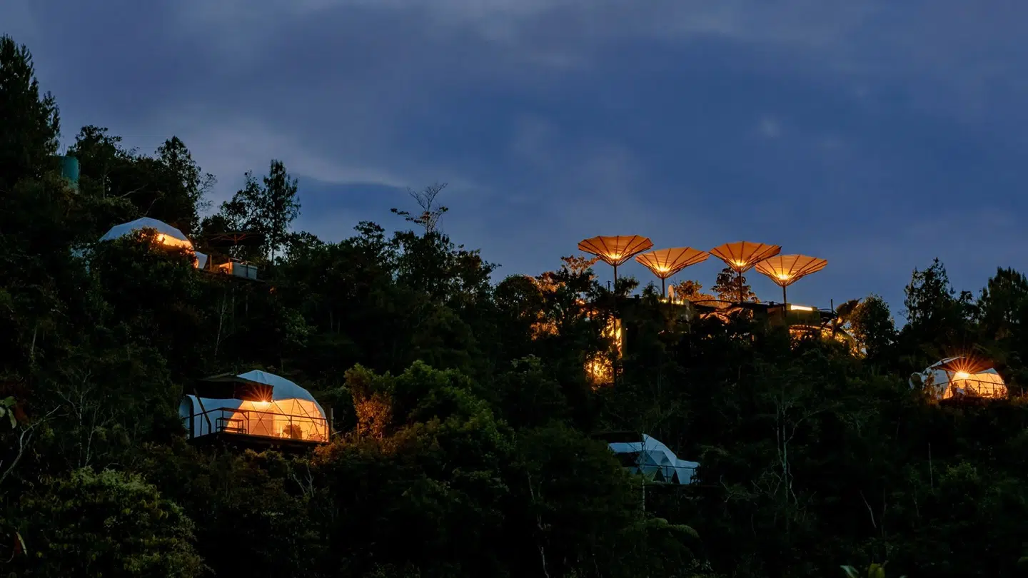 High in Colombia’s coffee region, Bosko feels cinematic. Its cocoon-like cabins hover above emerald valleys, framed by floor-to-ceiling glass. At night, the forest disappears into darkness, leaving only stars and silence. It is a place designed for stillness, where luxury reveals itself through restraint.
