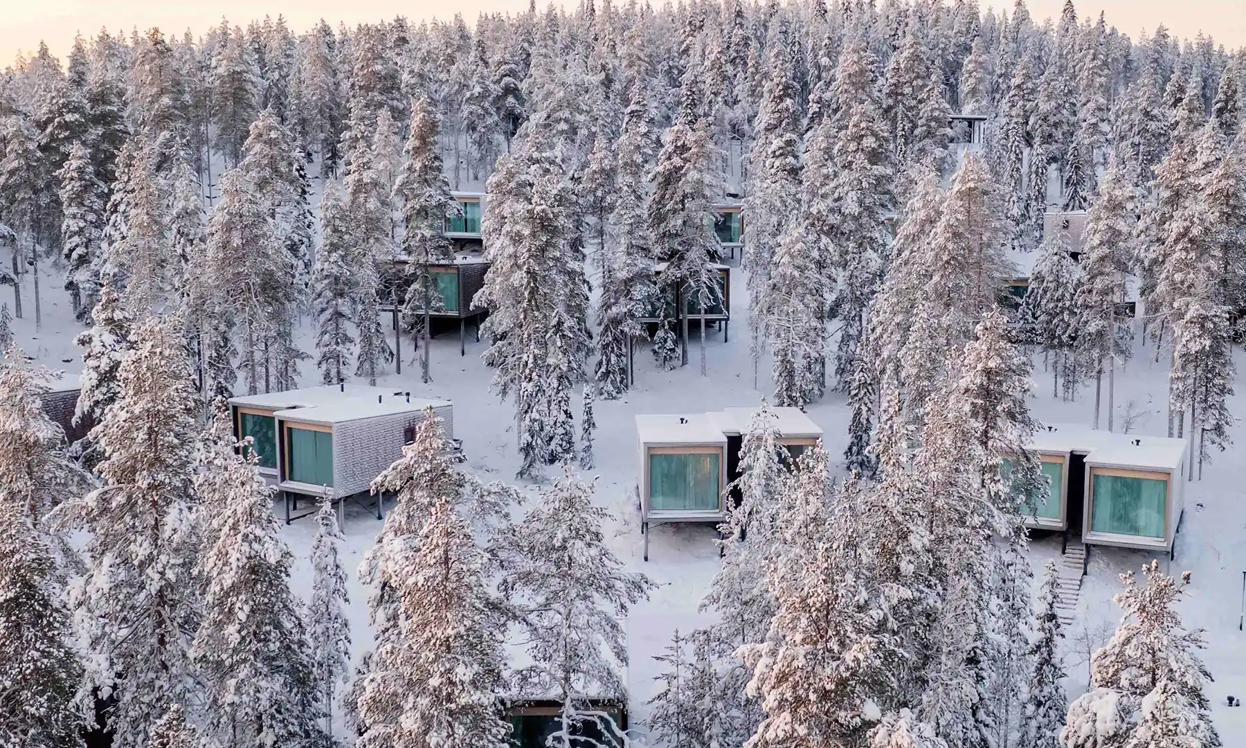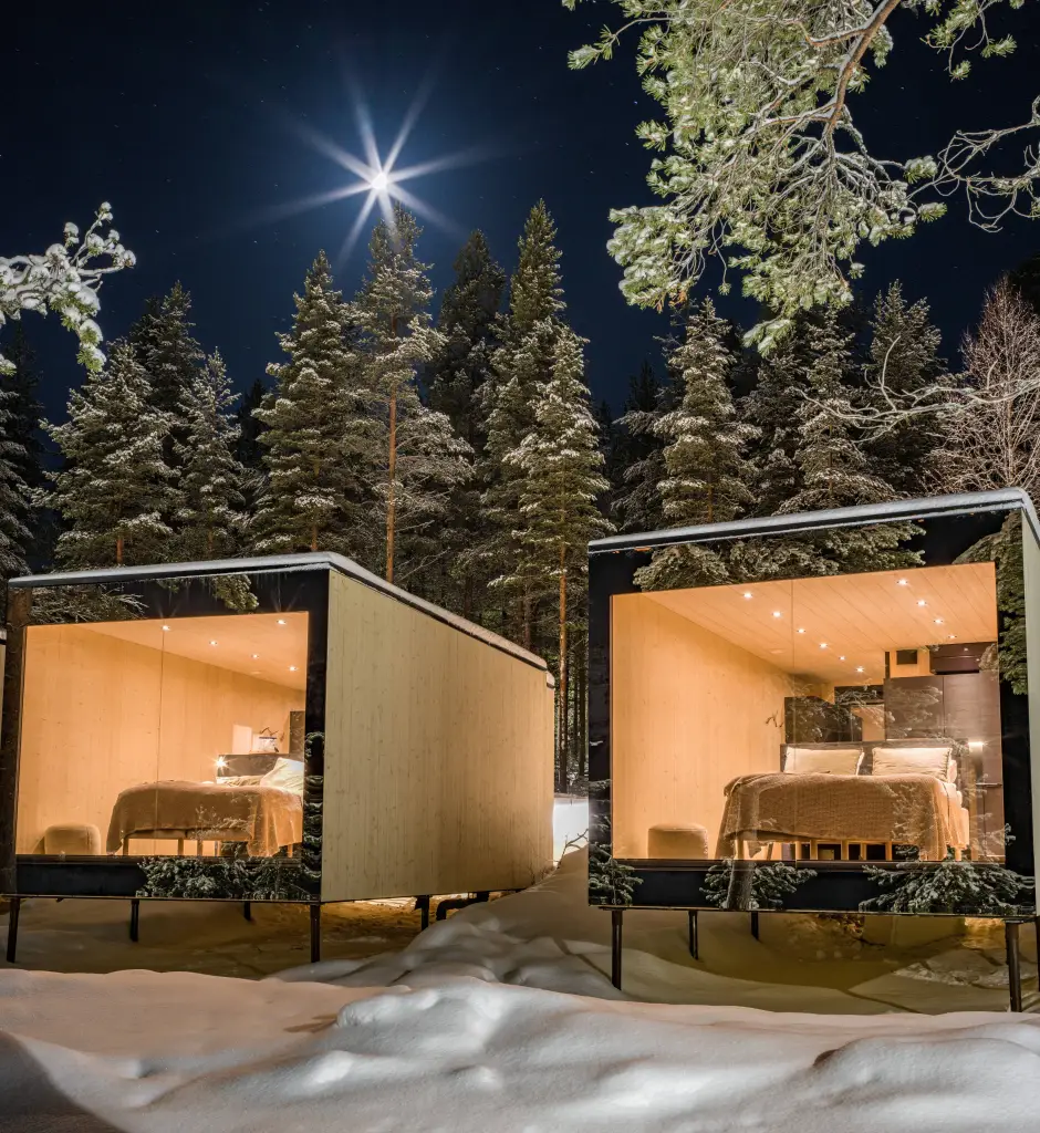 Rising from a forested ridge outside Rovaniemi, the Arctic TreeHouse Hotel offers a futuristic take on wilderness luxury. Its angular, elevated suites appear to float above the snow, each oriented toward panoramic Arctic views.