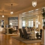 The new owners paid homage to the old Ocean House; more than 5,000 salvageable artifacts and furnishing elements were harvested from the original structure and many of them – including a massive, 12-foot antique mirror – now grace the new building. The elevator is the original, too, iron grating, wood paneling and all, just expanded to make it roomier. The front desk (expanded to make room for computers) and front door from the original are here as well.