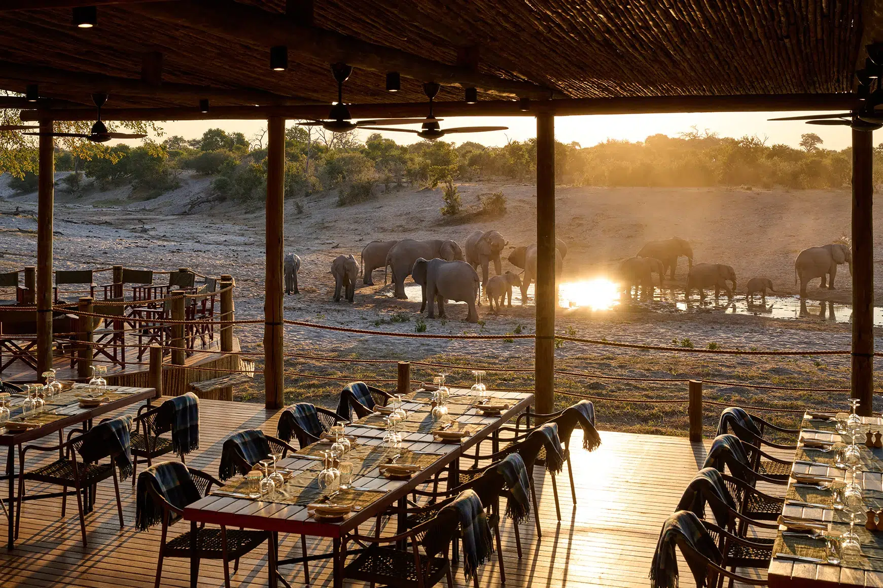 Dinner is served on the deck overlooking the watering holes, and the food is delectable. Starters are followed by the main course, with dessert as a sweet conclusion to