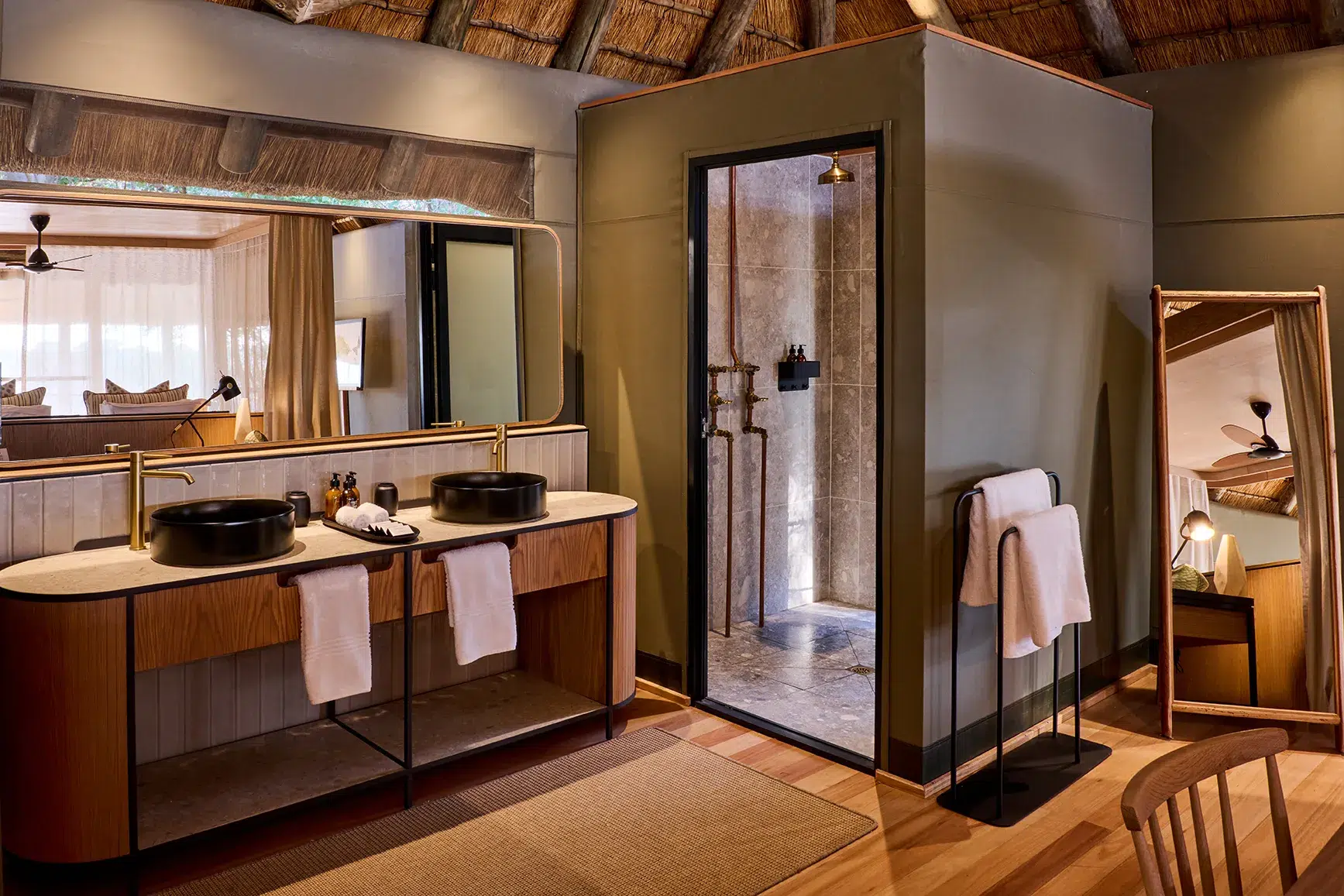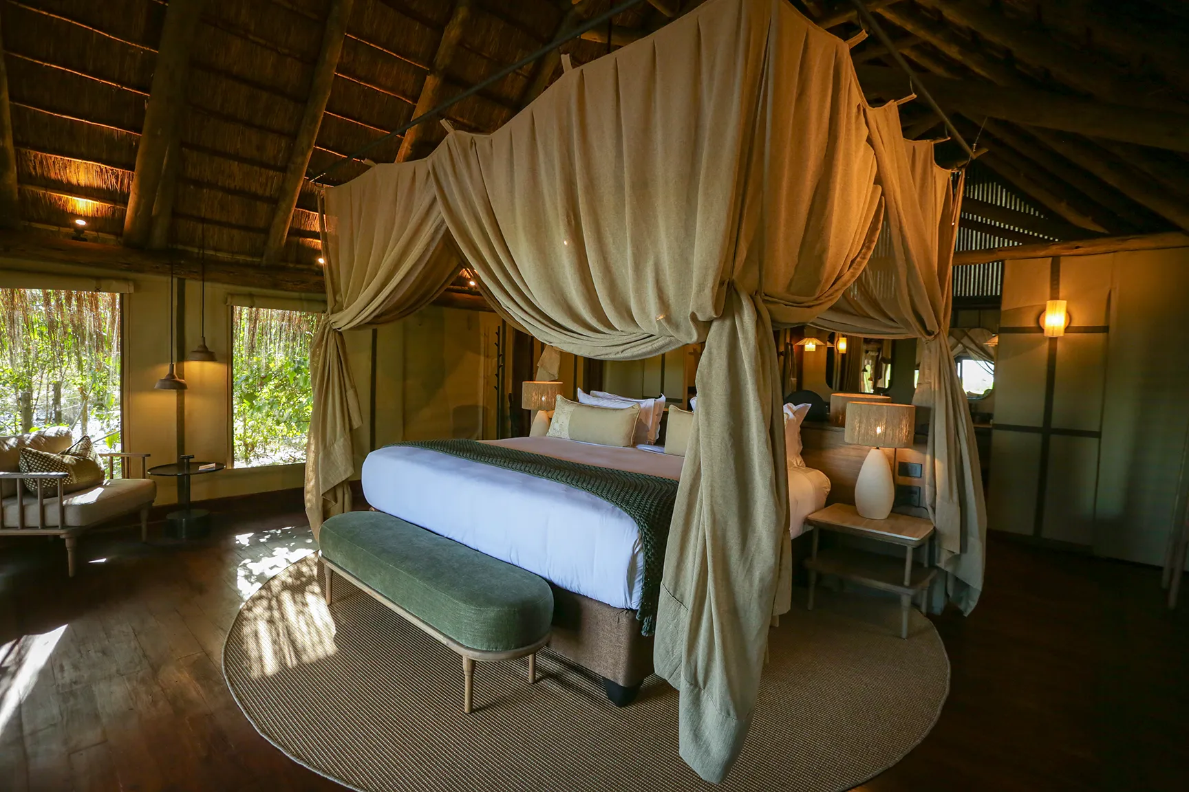 The safari suites are large structures, with a juxtaposition of wood, canvas, and thatch. Swinging the heavy front door open, I step into the cool room, where dark wooden flooring paves the way to a dreamy bedroom and a bed covered in silky, soft white bedding. The mosquito net, which encircles the bed, is placed a few feet away from each side, adding an additional sense of space. Accents of green, beige, grey, and cream pay homage to the surrounding bush. Double vanities in the bathroom are framed by identical mirrors, and there is closet space on either side of the wall. Enjoy a rain shower using the fragrant Charlotte Rhys products before turning in for the night.