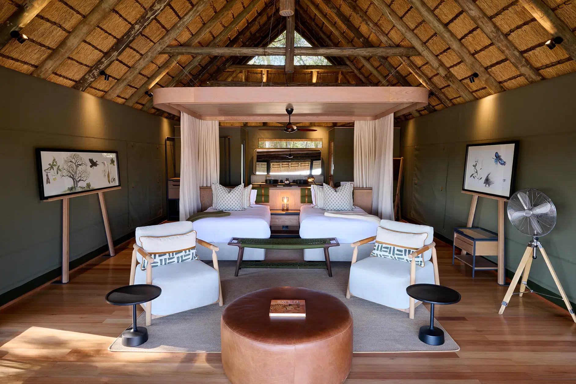 Creating a timeless and memorable guest experience was the blueprint for Savute Safari Lodge. With the clever implementation of natural materials such as weathered woods, rawhide, and woven textiles, they reflect the rugged beauty of the surroundings. Subtle animal prints in the form of scatter cushion covers and earthy tones harmonize with the natural environment outside your chalet. I’m staying in chalet number 9, which has an imposing sausage tree on the right-hand side of my private verandah. Artwork by Sarah Kelly is framed and placed on both sides of the room.