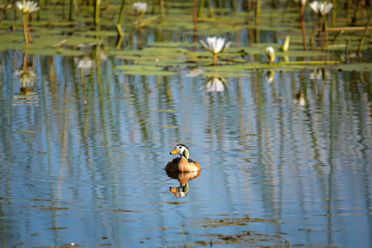 Situated in the Khwai Concession in north-western Botswana, Sediba Sa Rona is fronted by the Khwai River, where a large variety of bird species frequent the aquatic nirvana that they find themselves in. Each of the fifteen safari suites has unimpeded vistas over the river, and it’s not uncommon to spot wildlife from the comfort of your private veranda. Sliding the doors open, a small bird is floating amongst the papyrus and water lilies. Is it an African Jacana? On closer inspection, it has a bright yellow bill, green ear patches, and metallic green on its back. It is a male African pygmy goose, and he is gliding towards me.