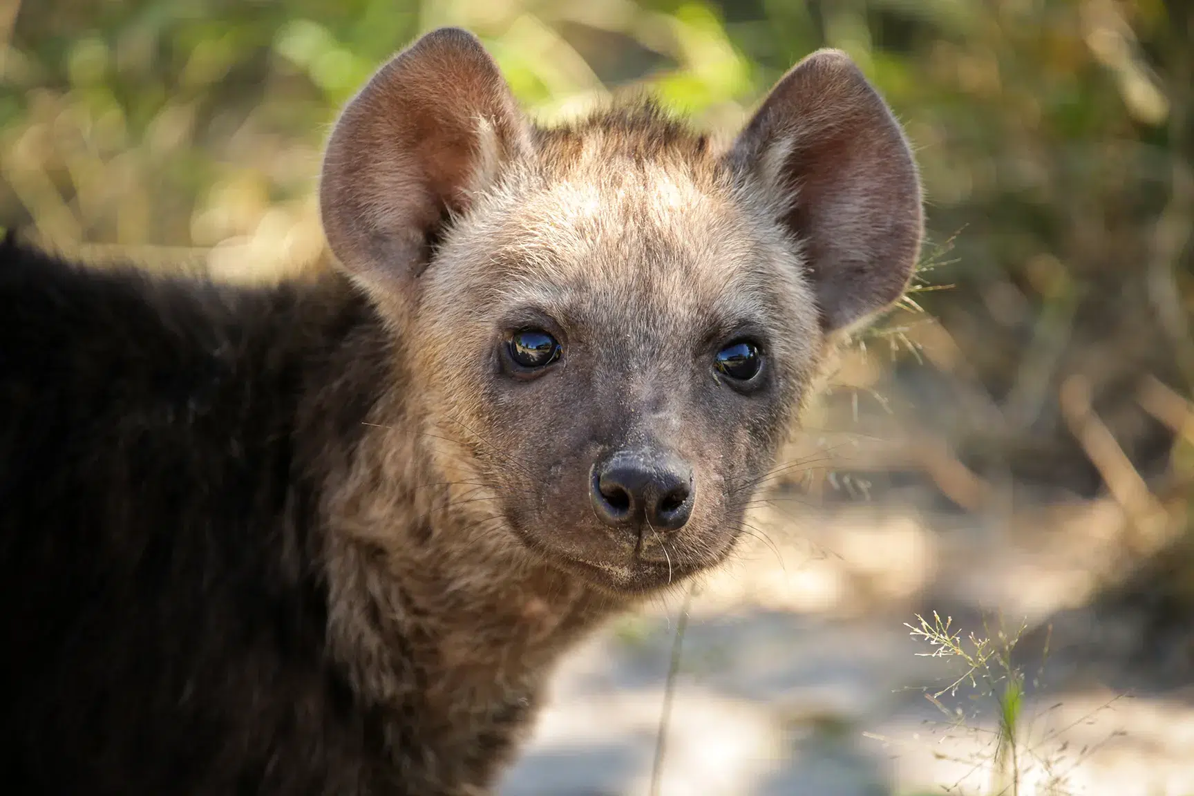 After breakfast the next day, NT wants to see if he can find the leopard and her cub again. They had finished their impala carcass and, with no food to come back for, had vacated the tree. We see loads of other wildlife – zebras, impalas, kudus, elephants, and the most adorable hyena cub. An adult is lying on the side of the road, which makes us investigate whether there is activity at the den. A few of the older cubs are huddled together, and two younger ones appear, clearly very curious.