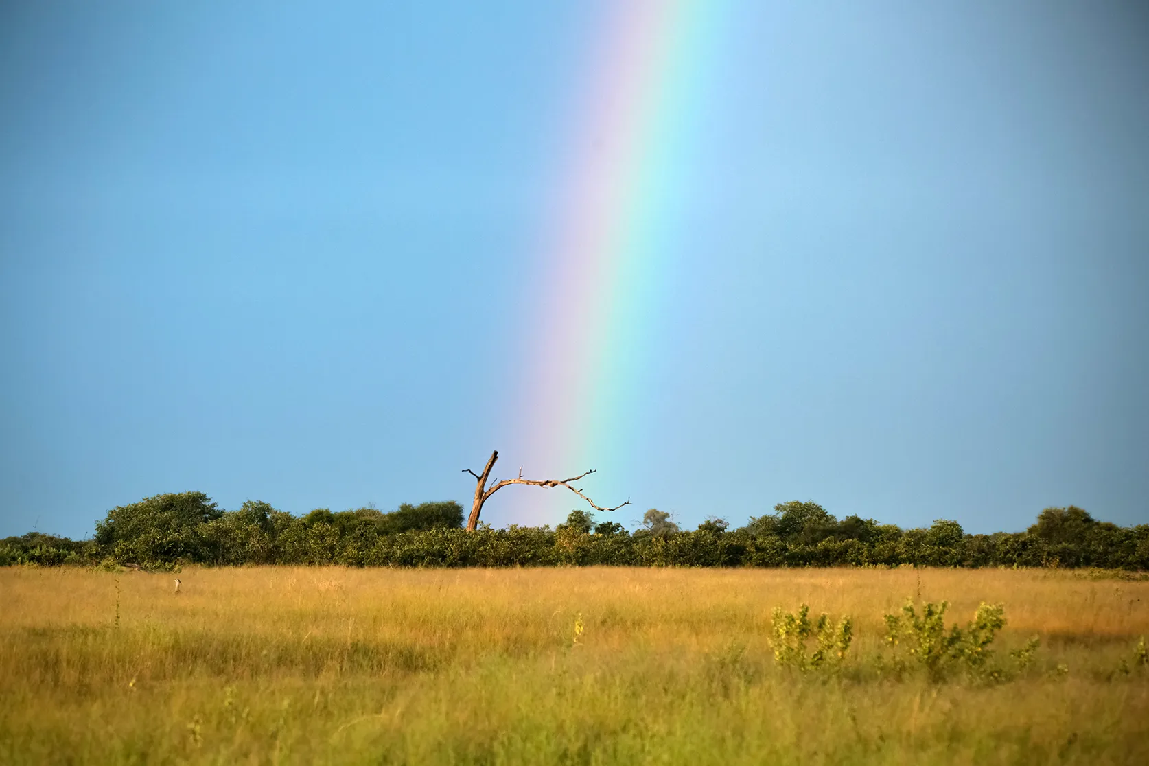 After high tea, we are wondering whether a game drive is likely to happen since the most incredible electric storm has set in. Thunder, lightning, and rain might be a deterrent, but it has tapered off into a slight drizzle. The wildlife also seems affected by the change in weather – a wildebeest foal is hopping along across the plains, much to our amusement. We spend time with a Kori bustard, which has its tail feathers spread out. The magnificence of seeing a double rainbow on safari is an extraordinary sight.