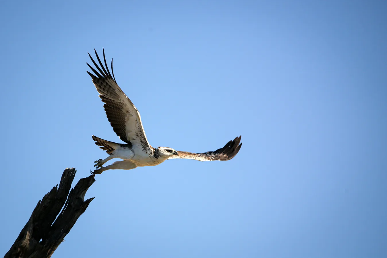 Ending the trinity of Desert & Delta Safaris on a high note, we bear witness to an African Harrier Hawk and a juvenile Martial Eagle perched on the same tree, with the hawk on the top branch. All of a sudden, both birds take flight at the same time, and it looks as though the hawk is trying to catch the eagle.