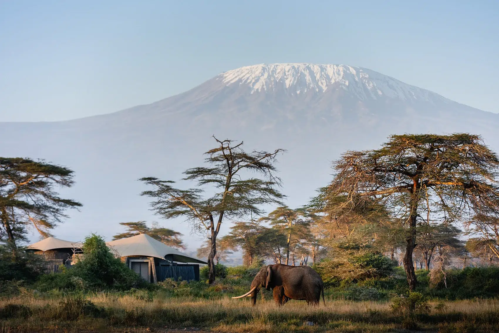 Mount Kilimanjaro, the highest free-standing mountain above sea level in the world. Towering at 16,100 ft. above the plateau base, this iconic dormant volcano forms the foreground to a stay at Angama Amboseli.