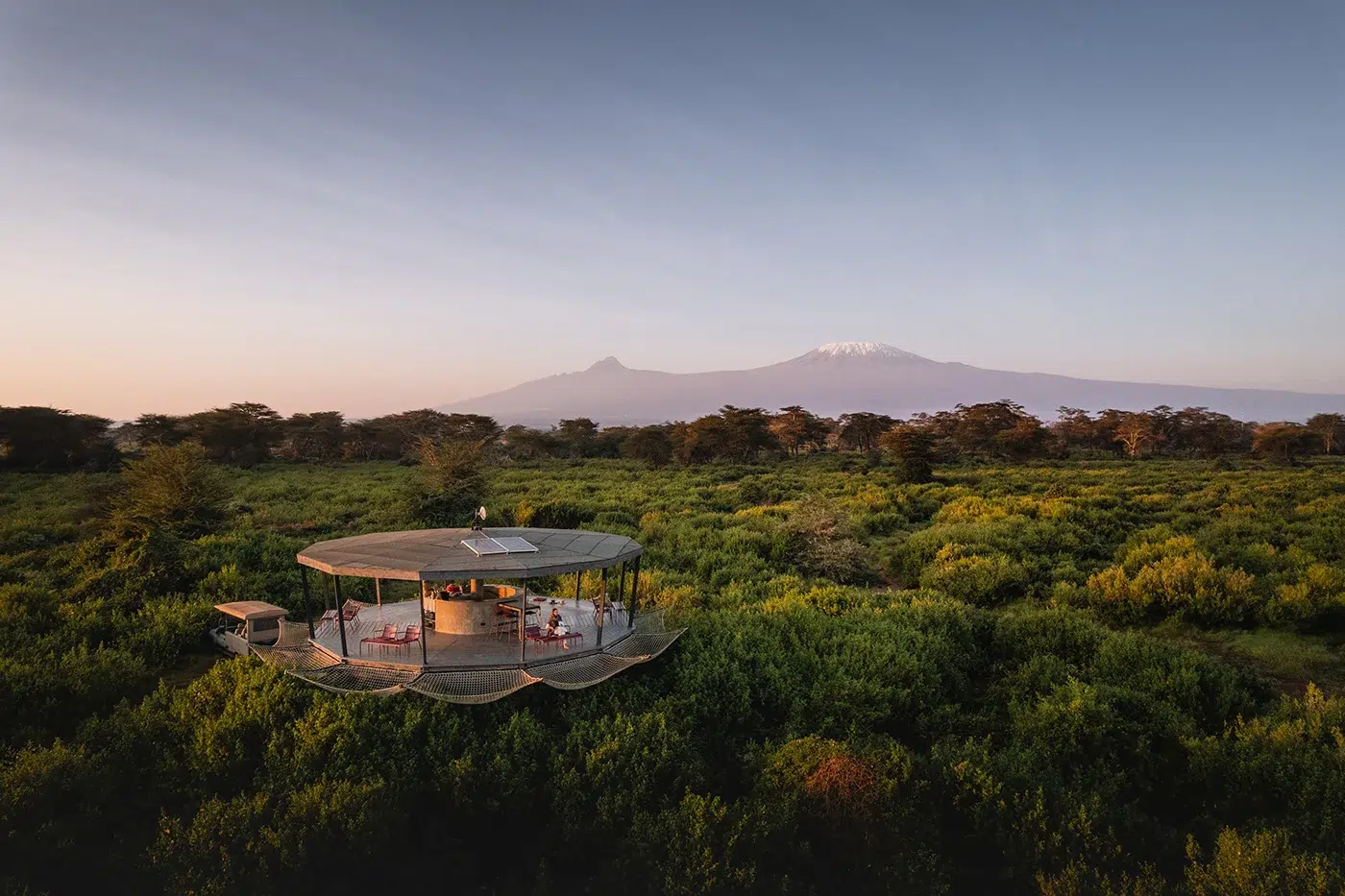 Wraparound views from the dining area, swimming pool, and guest suites were the concept for where the property would be facing. A flight with Safarilink from Wilson Airport takes me to the Amboseli airstrip, where safari guide Leshan greets me at the bottom of the Cessna 208’s stairs. Arriving just before 8 am, breakfast has been set up next to the Angama Amboseli safari vehicle on a picnic table with two chairs.